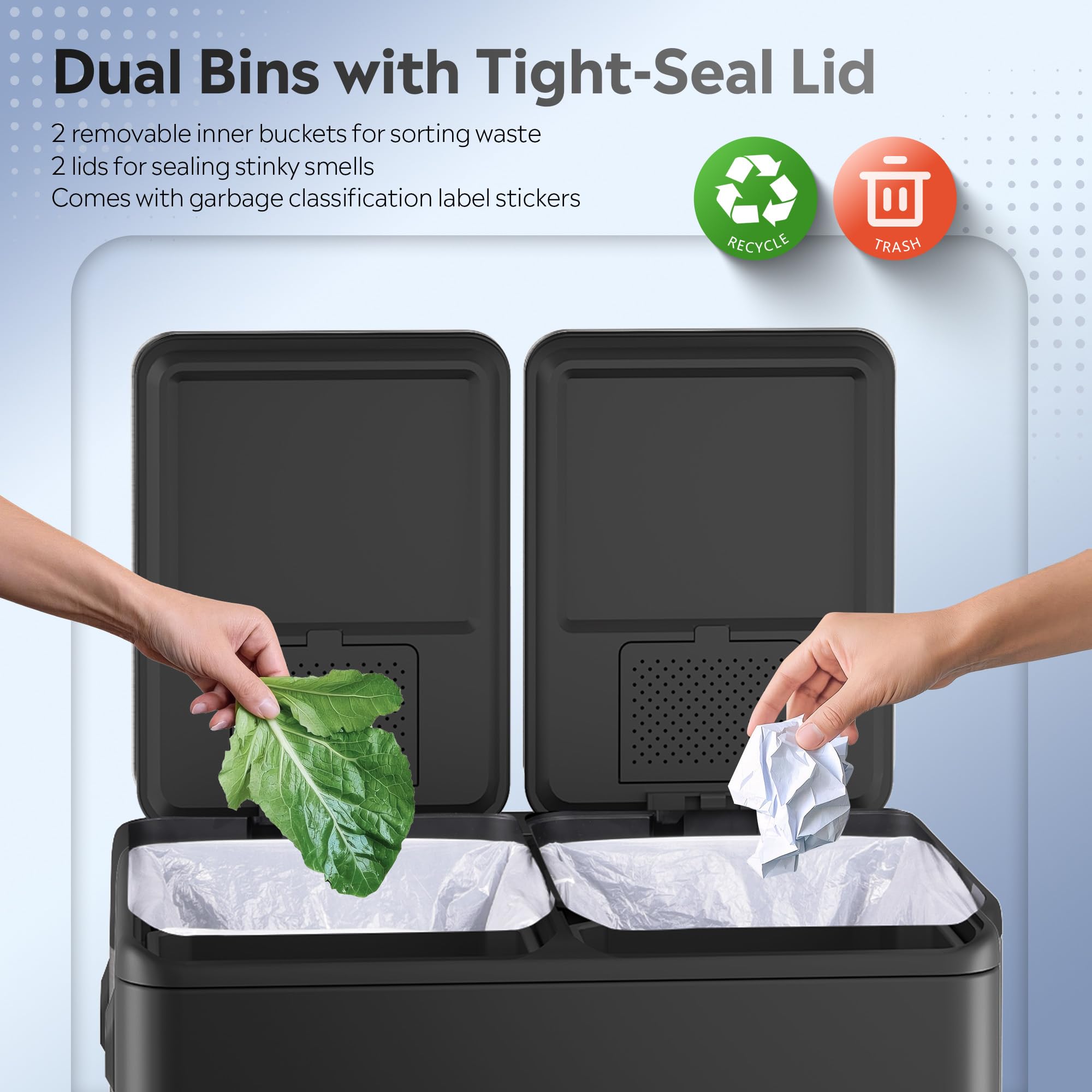 【Dual Compartment Design for Efficient Sorting】This kitchen trash can features two separate 8-gallon (30L) removable inner buckets with fixed slots and sorting stickers, making it easy to distinguish between trash and recyclables. Ideal as a recycle bins for kitchen, it maximizes space without clutter, supporting organized waste management in any home setup.*Tip: For best fit, use 27"+ length or 12+ gallon trash bags.*