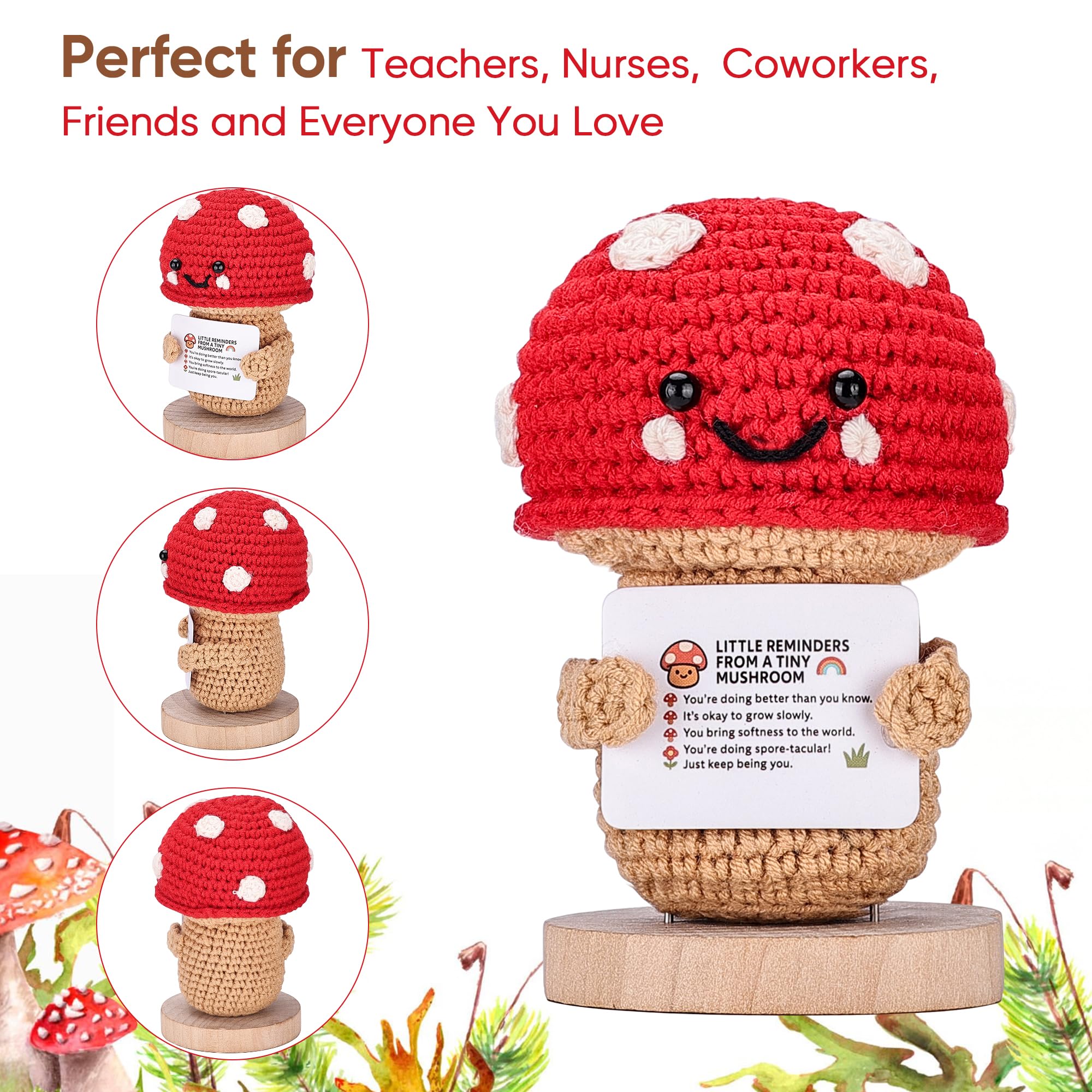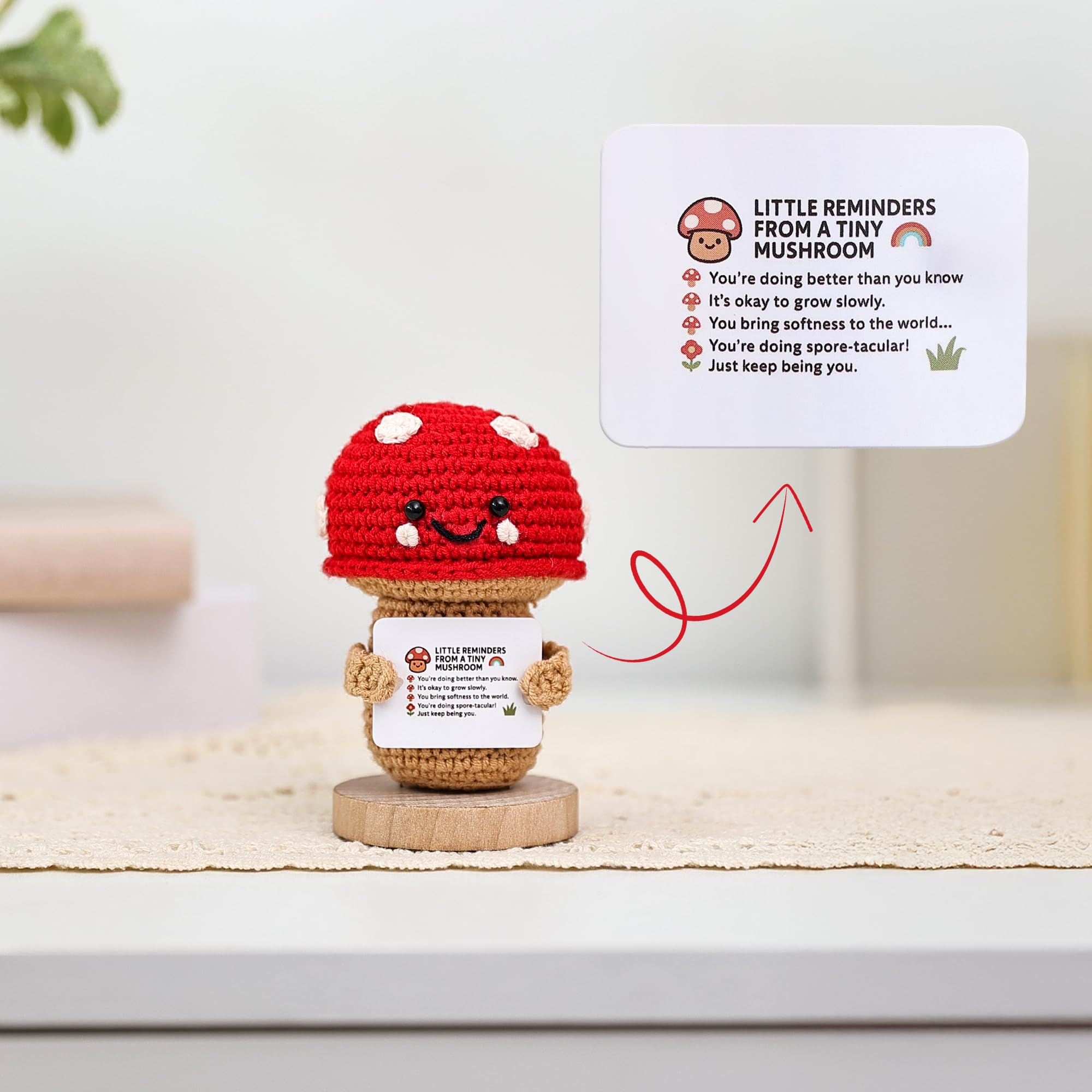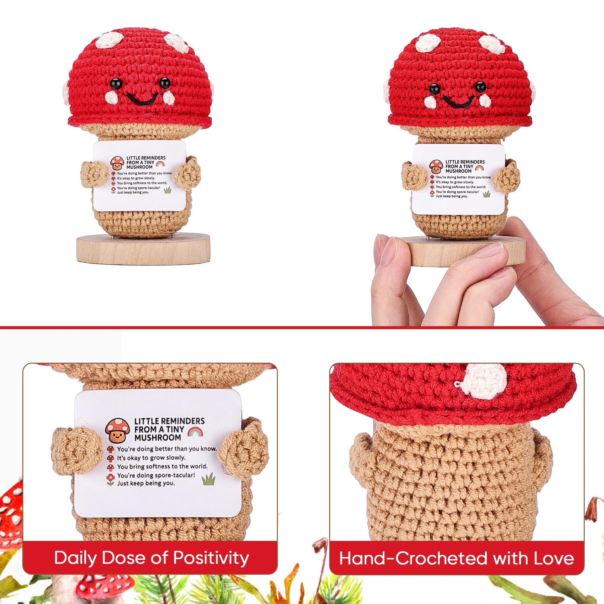 đ Product Description Brighten your day and lift your spirits with this adorable crochet positive mushroom doll. Lovingly handmade from soft, high-quality yarn, this tiny toadstool buddy holds a mini inspirational card filled with words of encouragement like âYouâre doing spore-tacular!â and âItâs okay to grow slowly.â Whether you're going through a tough time or simply want a daily dose of positivity, this cheerful mushroom offers comfort, support, and a smile. It's like a pocket-sized friendâperfect for your home desk, office shelf, bedside table, or to keep in your bag as a little reminder that youâre not alone. Soft to the touch, durable, and full of charm, this knitted mushroom plush is more than just dĂ©corâit's a heartfelt gift. Share one with someone you care about on a birthday, during exams, before a big meeting, or just because. Ideal for teachers, coworkers, students, kids, partners, or anyone who could use a little boost. Add a sprinkle of joy and encouragement to your space with this funny, motivational, and cute mushroom dollâa thoughtful token that reminds you every day: You're doing better than you think.