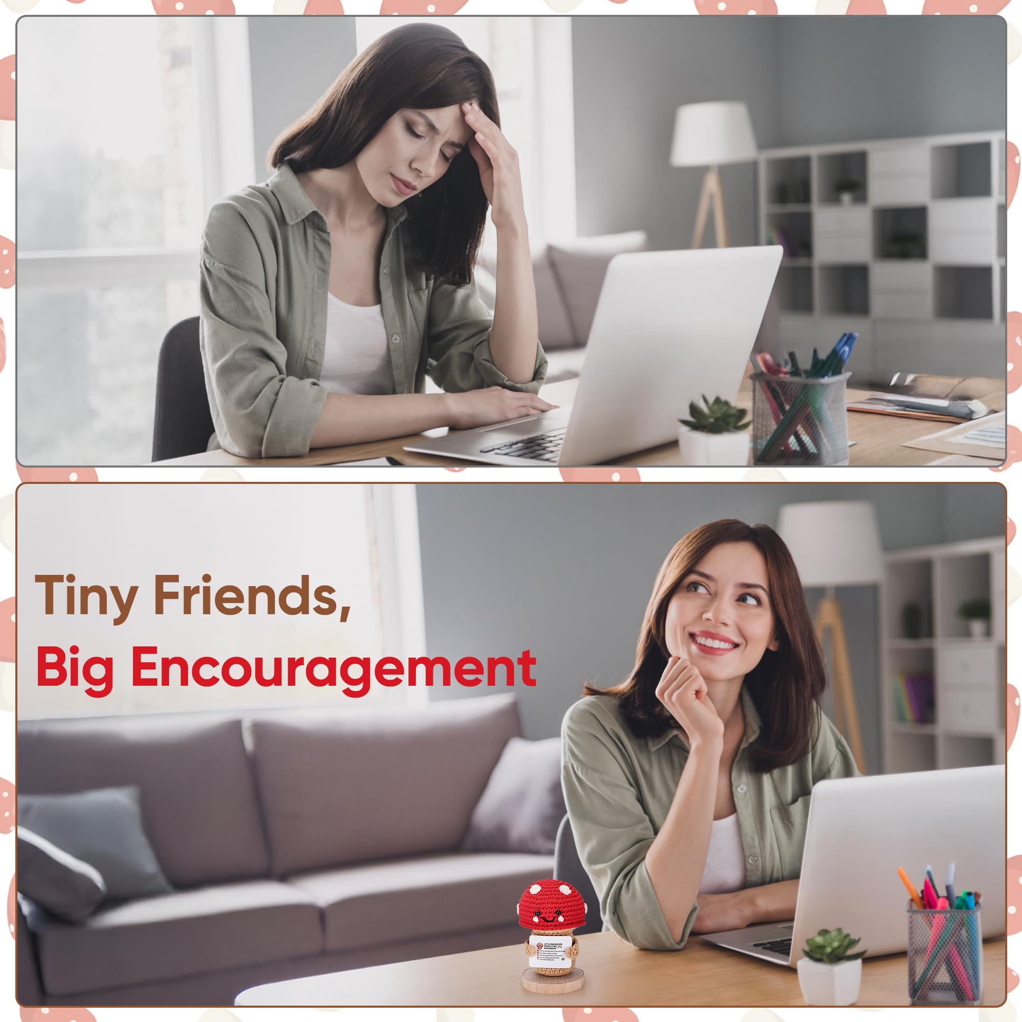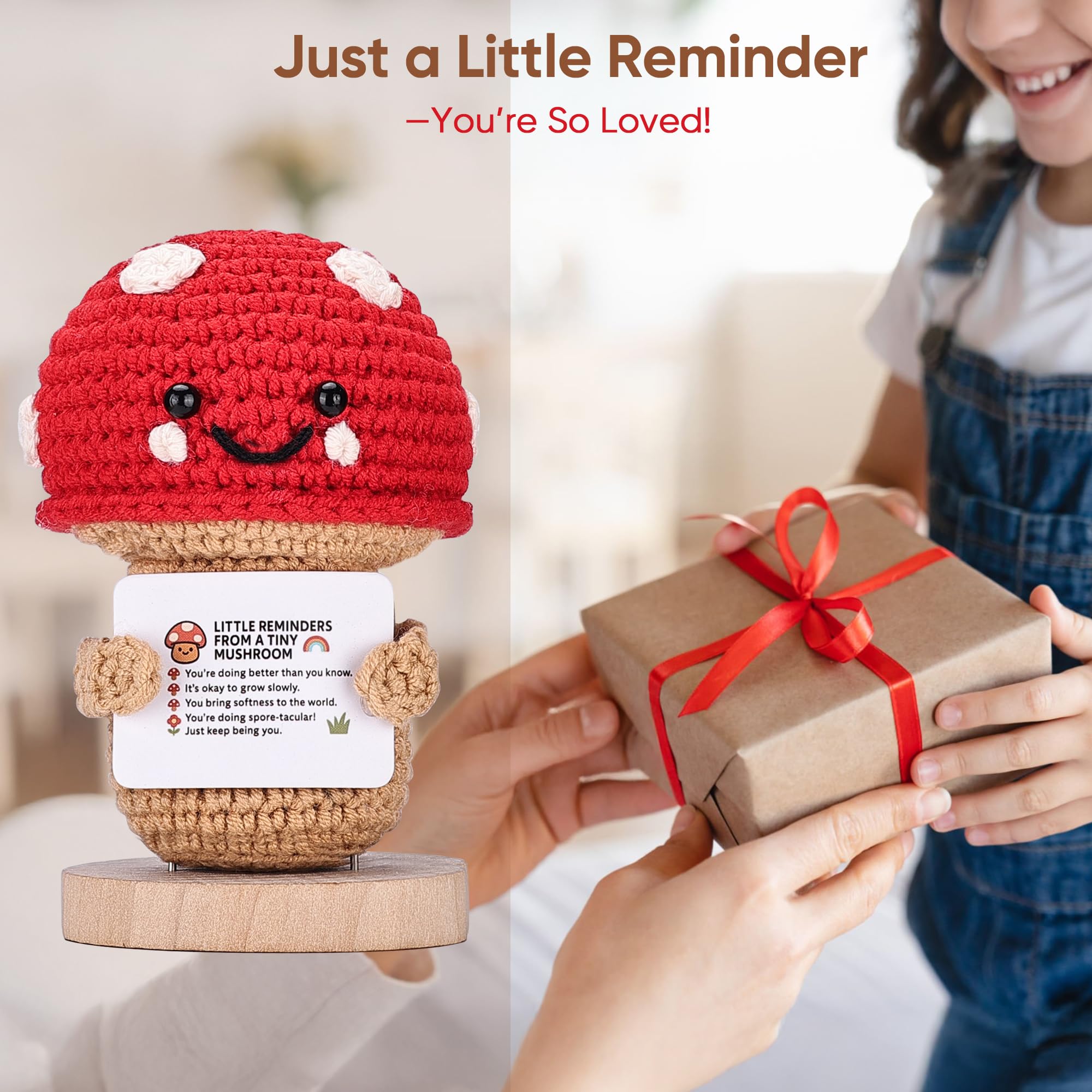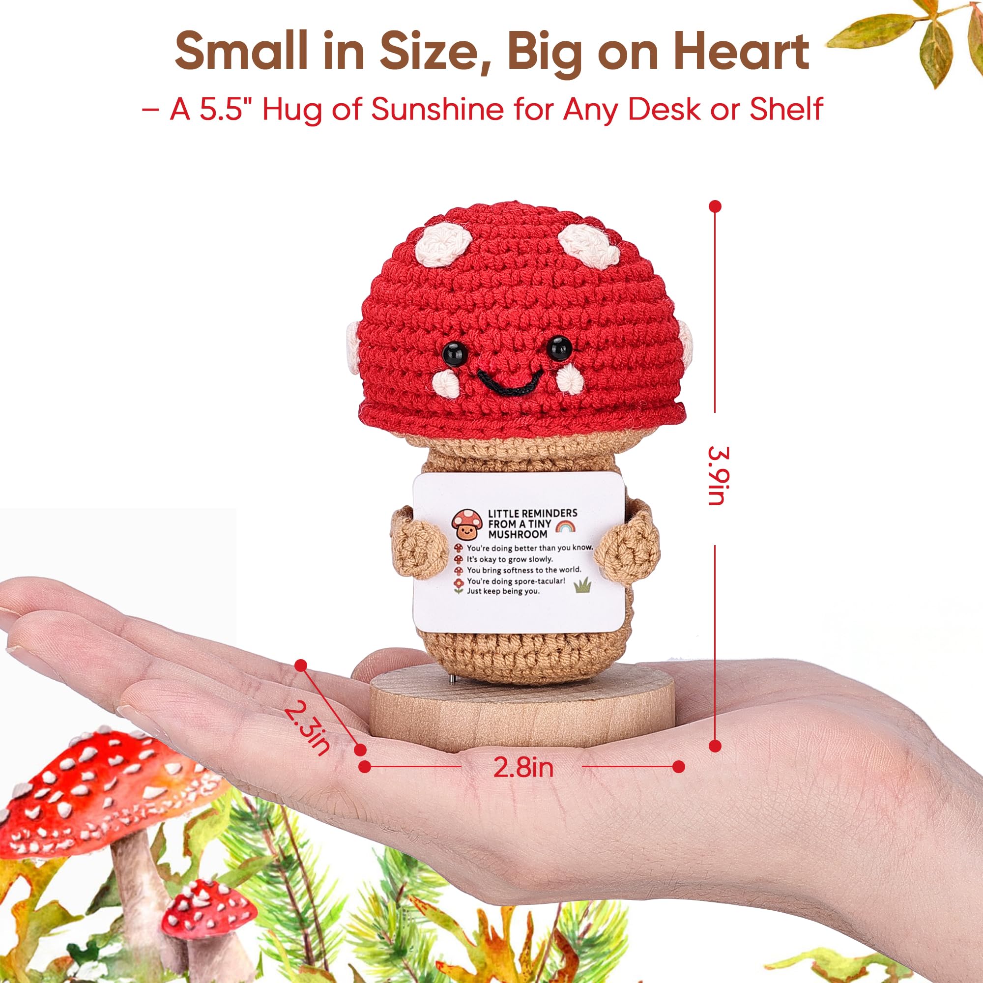 đ Product Description Brighten your day and lift your spirits with this adorable crochet positive mushroom doll. Lovingly handmade from soft, high-quality yarn, this tiny toadstool buddy holds a mini inspirational card filled with words of encouragement like âYouâre doing spore-tacular!â and âItâs okay to grow slowly.â Whether you're going through a tough time or simply want a daily dose of positivity, this cheerful mushroom offers comfort, support, and a smile. It's like a pocket-sized friendâperfect for your home desk, office shelf, bedside table, or to keep in your bag as a little reminder that youâre not alone. Soft to the touch, durable, and full of charm, this knitted mushroom plush is more than just dĂ©corâit's a heartfelt gift. Share one with someone you care about on a birthday, during exams, before a big meeting, or just because. Ideal for teachers, coworkers, students, kids, partners, or anyone who could use a little boost. Add a sprinkle of joy and encouragement to your space with this funny, motivational, and cute mushroom dollâa thoughtful token that reminds you every day: You're doing better than you think.