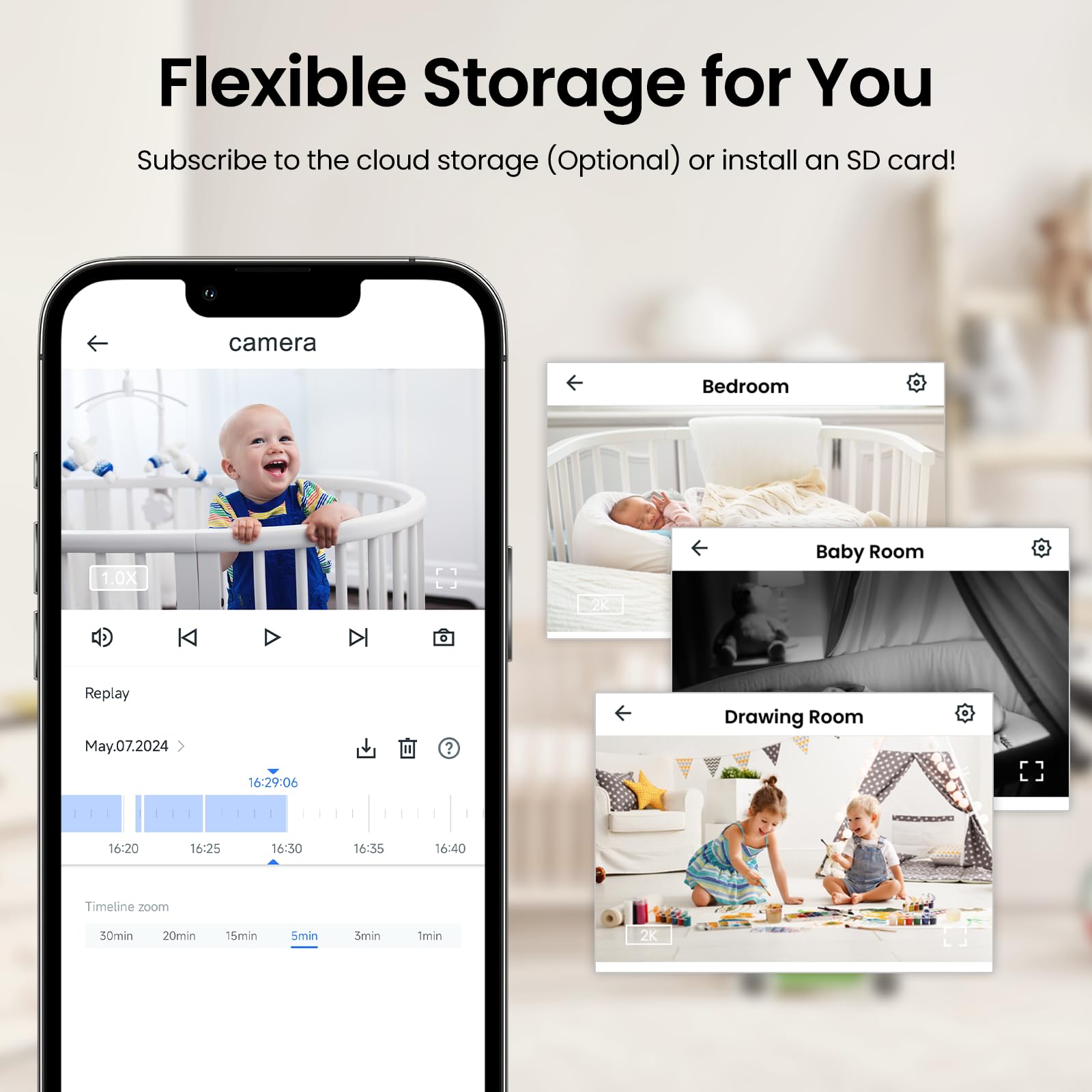 【5MP Super HD & Excellent Night Vision】: Cinnado baby camera monitor with 3K 5MP resolusion provides a crystal and vivid live stream, captures every detail clearly. While your baby or pet plays, you can double-click to zoom in on the video to see the details you care most. Nothing escapes your baby monitor! Built-in 4 940nm invisible IR lights, this 5MP baby camera displays high-quality video even in low light conditions at night, allowing you to see your baby clearly.
