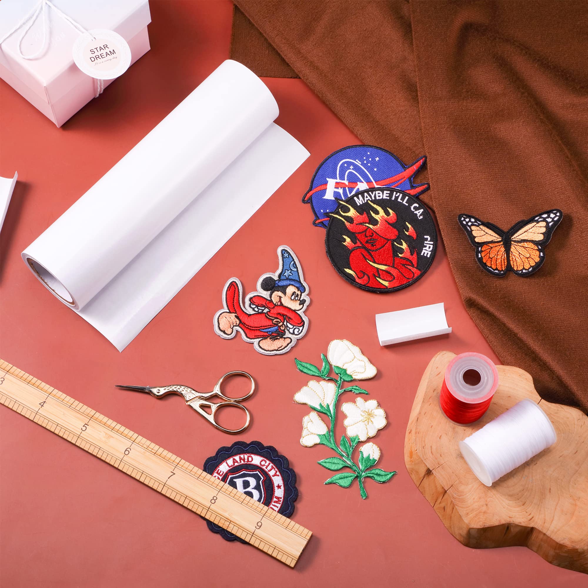 Simple to apply: just place the patch onto the fabric piece, cut along the outline, peel away the cover, and stick the exposed adhesive side onto your patch, finally peel away the remaining liner and adhere to the fabric, easy to use, and save you much time and energy
