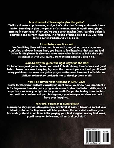 Ever dreamed of learning to play the guitar? Well it’s time to stop dreaming amigo. Let’s take that fantasy and turn it into a reality! Learning to play the guitar isn’t the monumental, uphill struggle you imagine in your head. When you’ve got a great teacher (me), learning guitar is enjoyable and so very rewarding. The feeling of being able to play your first song is just incredible...you’ll soon see! I tried before and it sucked You’re sitting there with a chord book and your guitar, these shapes are confusing and your fingers hurt, you begin to feel hopeless, that was me too! Guitar for Beginners is different as we know what it takes to build the right relationship with your guitar, from the moment you pick it up. We demystify the guitar for you Picking up a guitar for the first time can be pretty intimidating. How do I turn it on? How fragile is it? What the heck is even going on here? Take it easy buddy, there’s no need to freak out, Guitar for Beginners is exactly that, for beginners. We go through the very first steps and teach the super basics in the proper way. From how to hold a guitar pick to good playing posture, you’re getting a top-notch education. Learn to play the guitar the right way from the start To become a great guitar player, you need to build strong foundations and good habits. Learn the correct way to play from the moment you start and you’ll avoid many problems that even pro guitar players suffer from later on. Bad habits are difficult to break so the key is not to develop them at all! You’ll be playing your first song in just 7 Days! Guitar for Beginners will get you playing right away. We know how important it is for beginners to make quick progress in order to stay motivated. With years of experience we take you right to the good stuff. Forget the boring introductions and tedious exercises and get playing songs you love quicker than you could have ever imagined. What’s the first step? Teaching you how to properly hold your guitar and how to tune it. The book goes through every step to make sure you’re not starting on the back foot. Get the beginning stuff right and you’re guaranteed to succeed. If your guitar is upside down and out of tune, you’re not going to be doing yourself any favors! Reading guitar tablature made easy Become fluent in reading guitar tabs. Learning with tabs is the easiest way to start rocking riffs and learning licks from your favorite tunes. Discover new chords and memorize songs to impress your friends and family. From total beginner to guitar player Learning to play guitar is like gaining a new level of cool, it becomes part of your identity. Guitar for Beginners will take you from the very start and turn you bonafide guitarist in no time. After playing your first song in the very first week, you’ll move on to learning all sorts of cool stuff. Convinced? Of course, you are! So head back up to the top of the page and click & Buy now. Treat yourself to the gift of learning to play the guitar with Guitar for Beginners. It will enrich your life and provide many years of happiness all while looking damn cool!