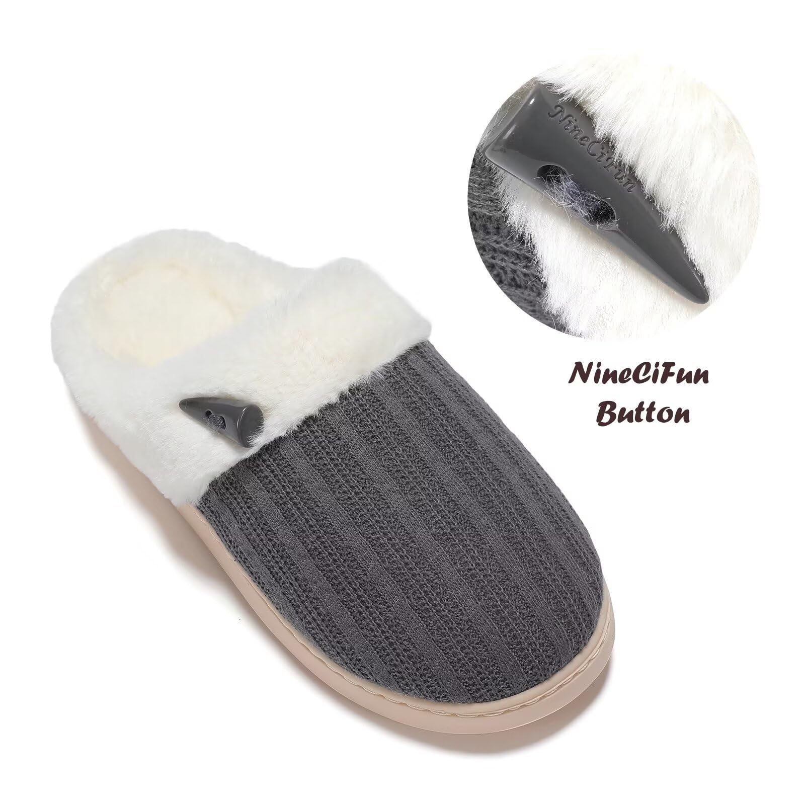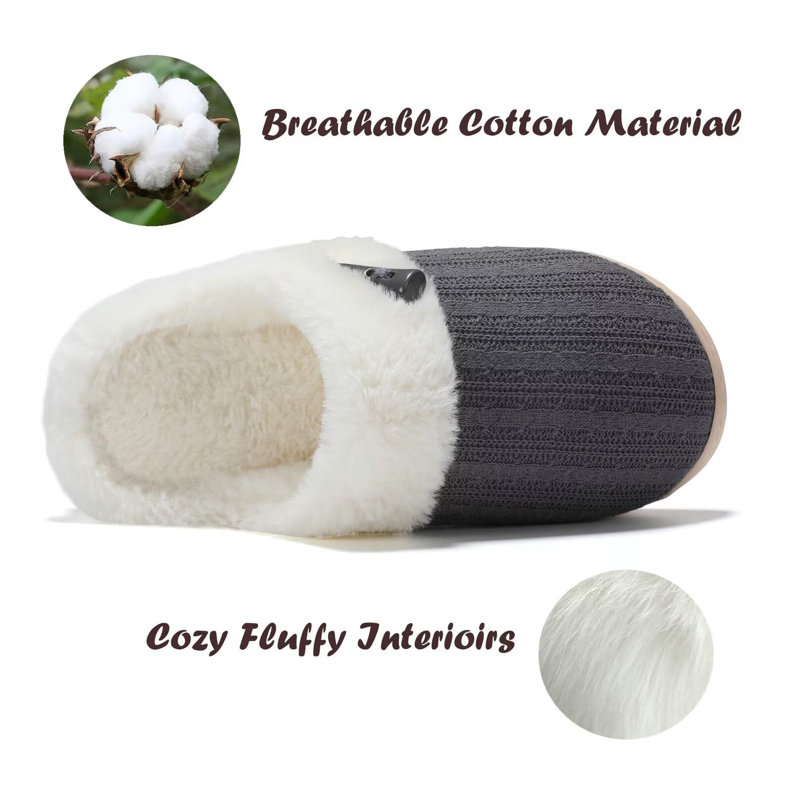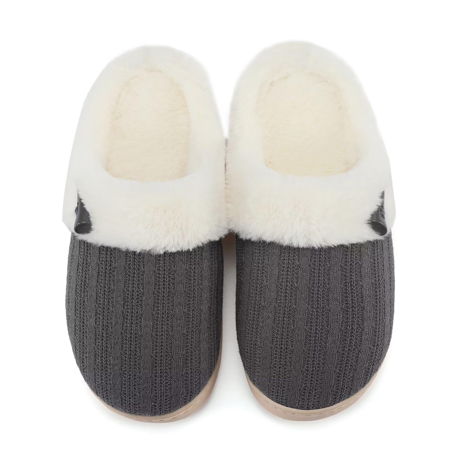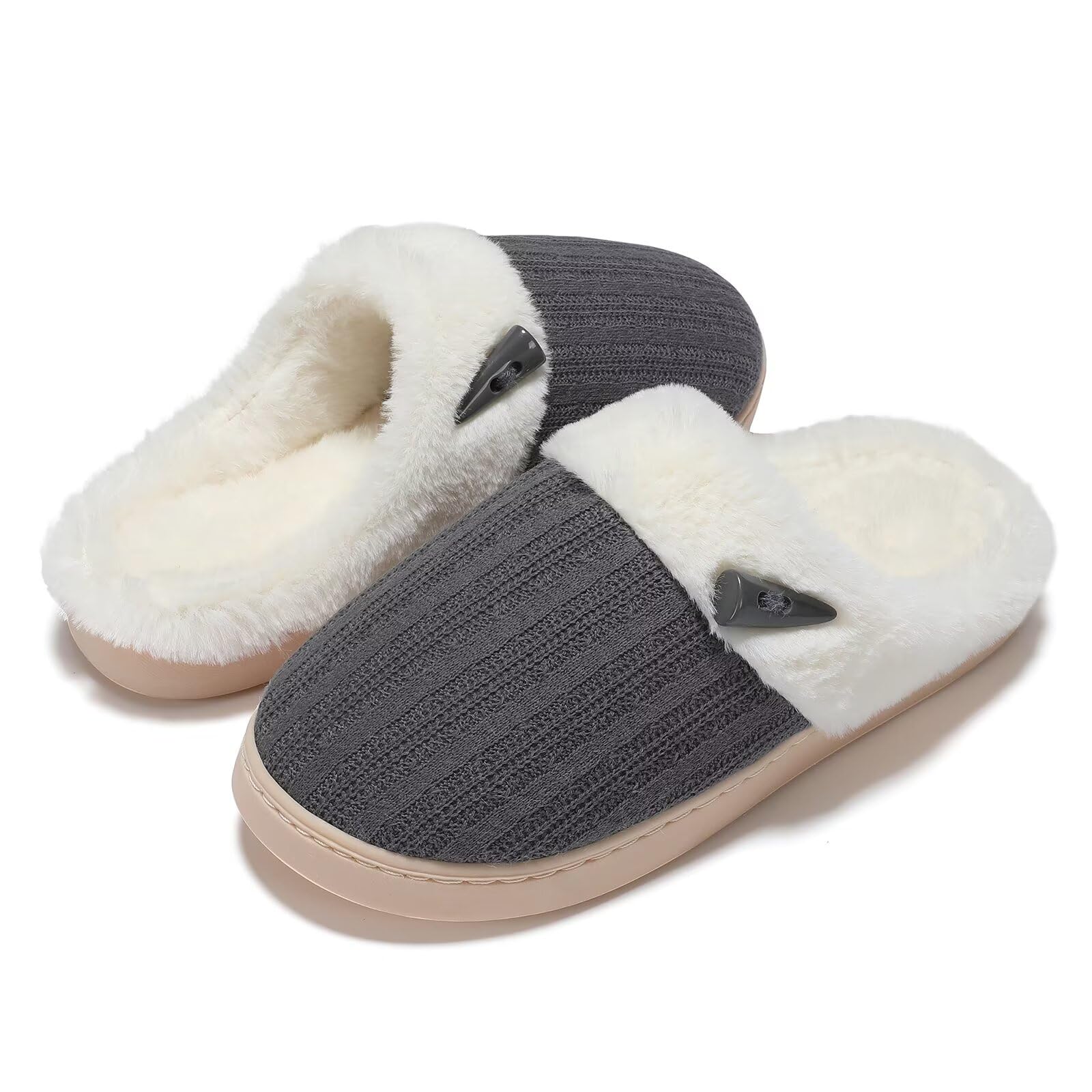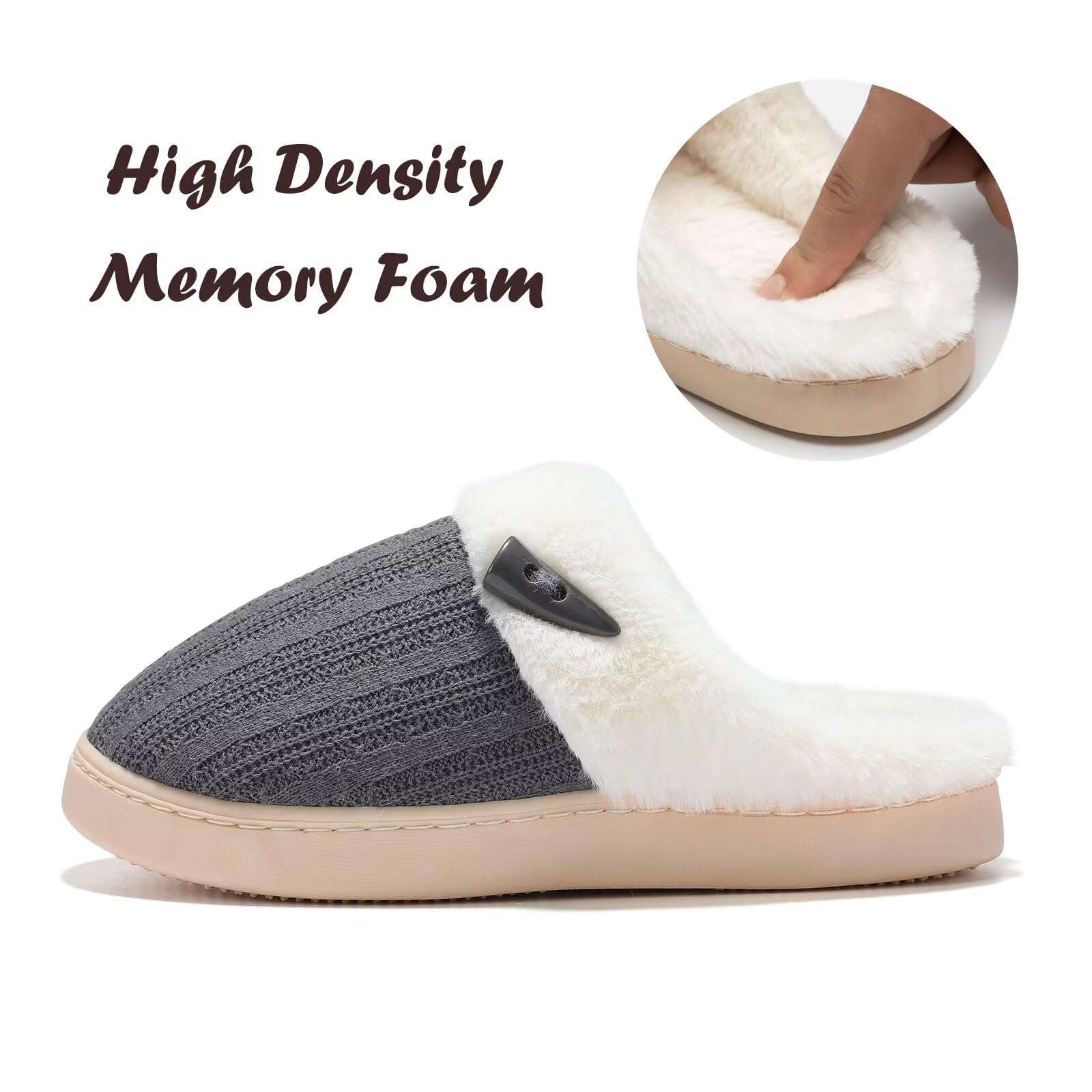 EASY SLIP ON STYLE:Step into comfort easily with these open back fuzzy bedroom slippers that are made with fluffy plush.Soft plush faux fur lining offers superior comfortability from the clouds.Also these comfy house shoes are so chic with knitting upper and horn button design