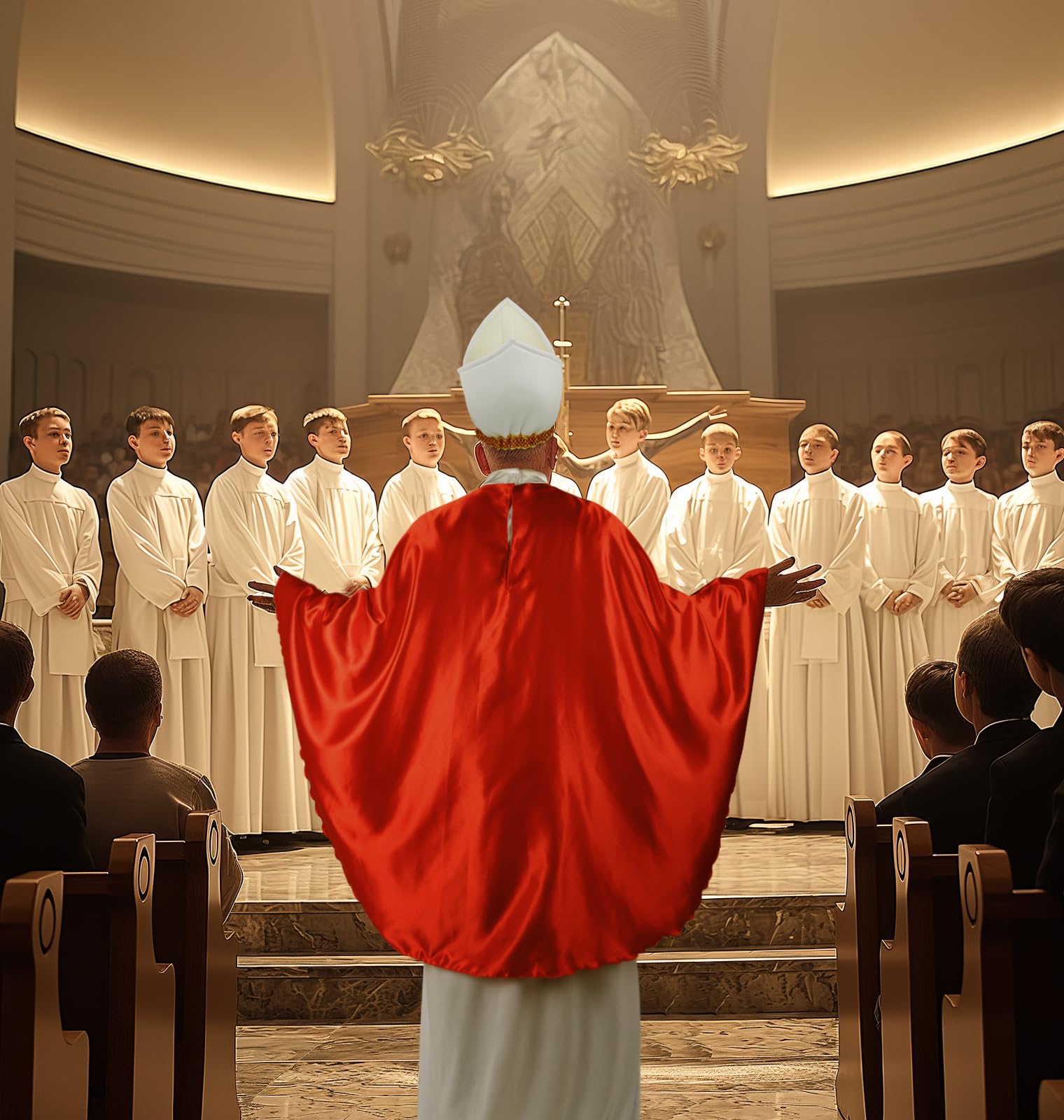 COMPLETE SET: Pope costume Includes a luxurious red papal robe with ornate trim detail, white undergarment, and decorative mitre hat with gold and red embellishments