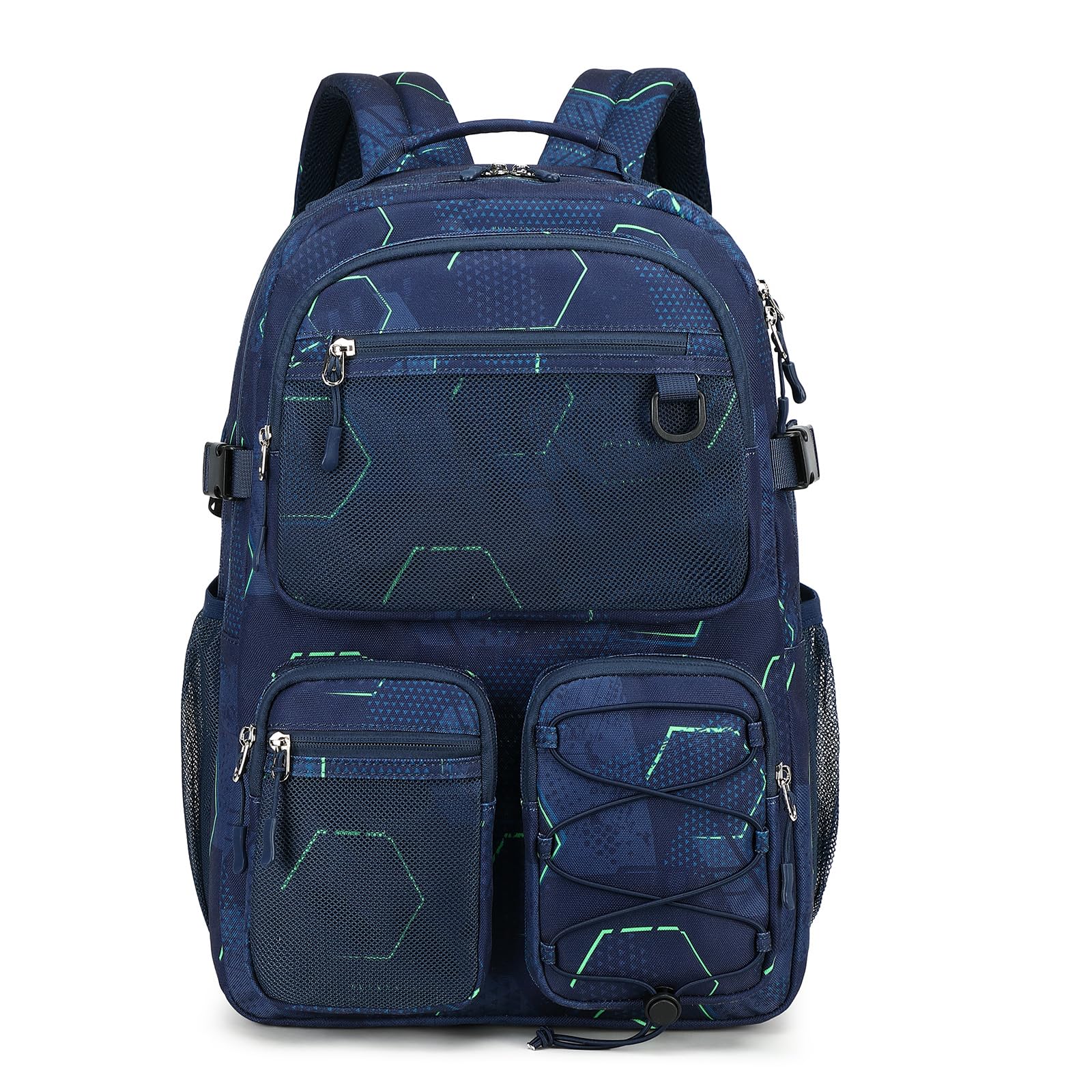 Description Multi-Pockets Backpack Weight: 1.56lb Dimension: 17.3×12.4×6.7 in Material: water resistant polyester Construction: 1 large zipper main pocket with 1 Laptop Compartment & 2 small open pockets 1 large sub zipper pocket with many organization pockets 5 zipper pocket in the front 2 Mesh side pocket Description: The multi front pocket fits for your keys, ID cards, wallet, power bank, etc. The side mesh pockets is perfect for folding umbrella and water bottle. The large sub zippered pocketcan hold magazines, A4 documents, pen, power bank etc. The Large main room can hold cloths, books, laptop, textbook and so on. The stylish backpack is great for everyone, it is suitable for travel, outdoor, sports, work, shopping and so on. Package Includes: 1 x Backpack
