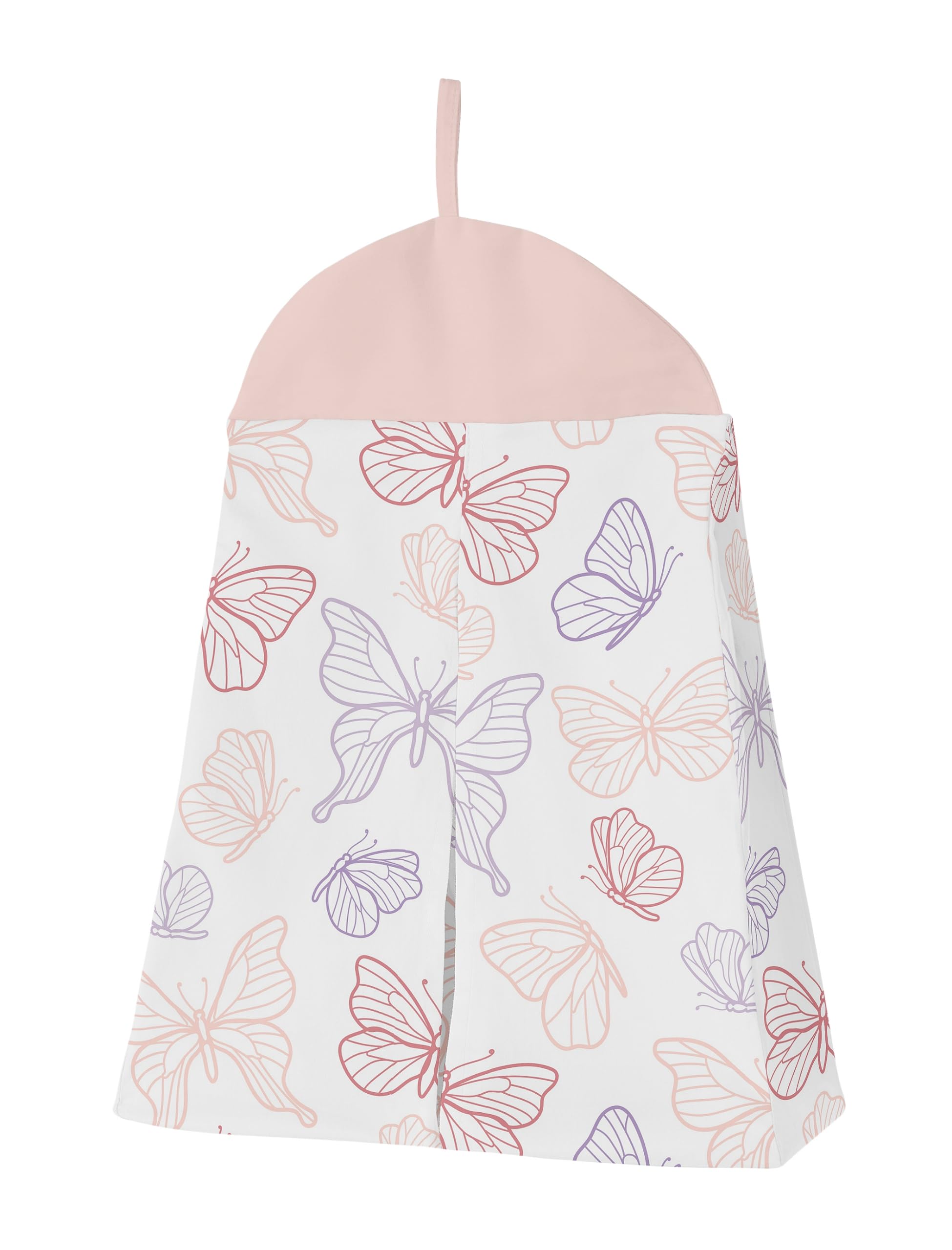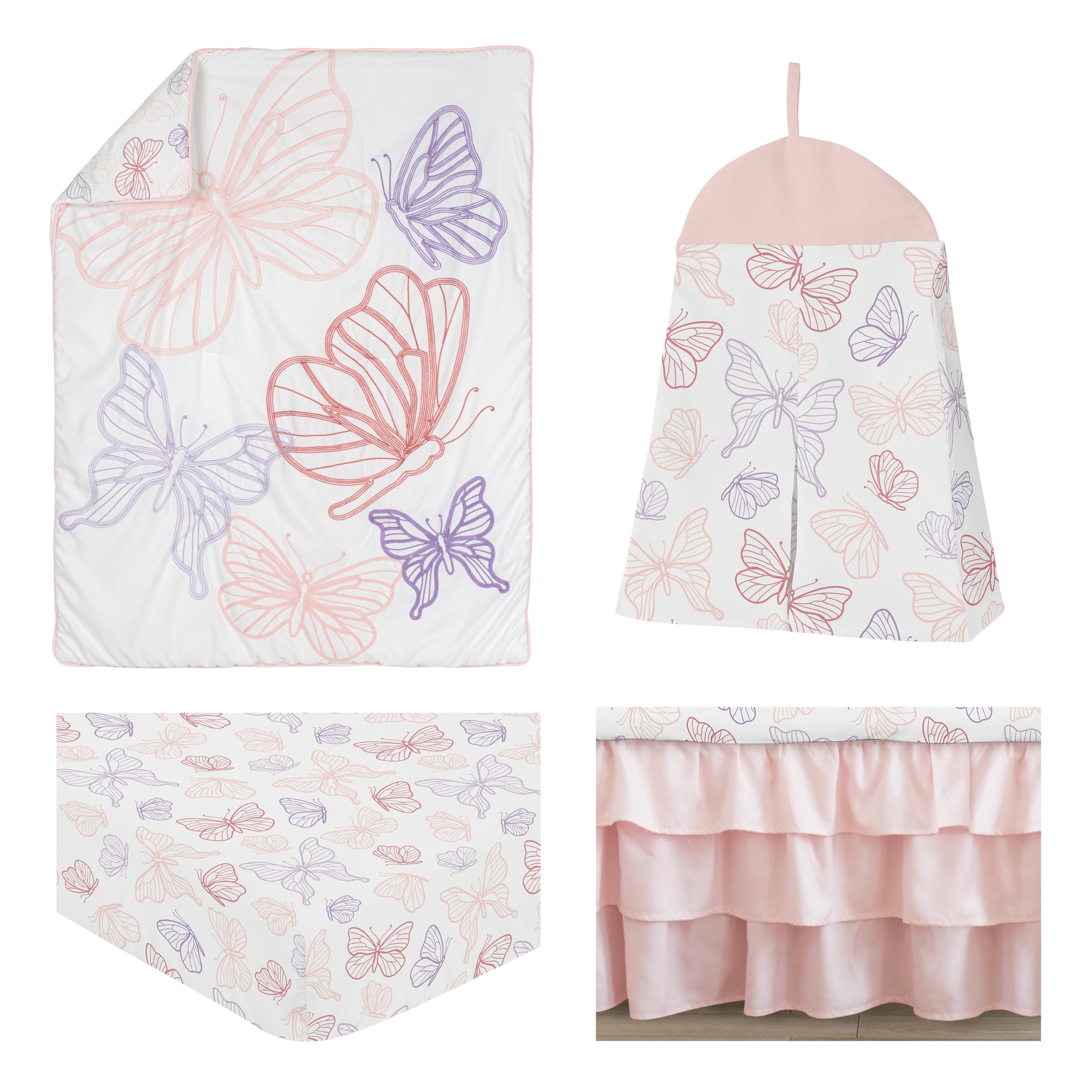 The perfect baby shower gift! All your baby room essentials can be found in one set for your nursery. Newborn blanket features a blush pink, purple and white shabby chic butterfly print and reverses to a smaller butterfly pattern. Ultra soft crib mattress sheet is made with brushed microfiber. Crib bed skirt dust ruffle features a solid blush pink. This set is made complete with the coordinating diaper stacker, featuring ties to conveniently hang anyplace in the bedroom to store diapers.