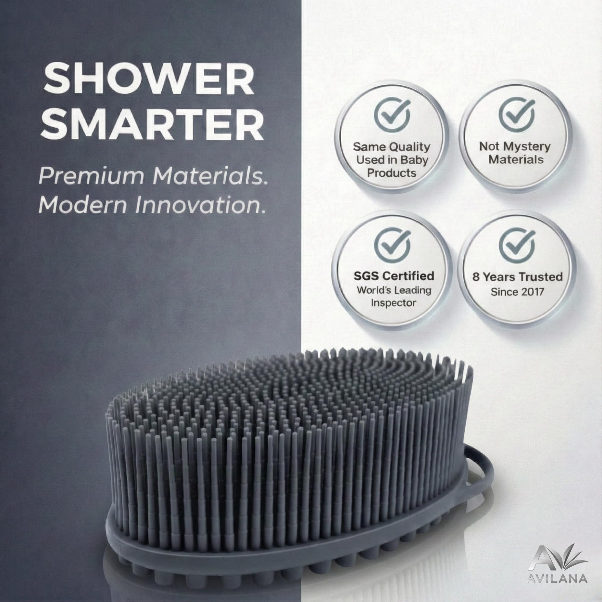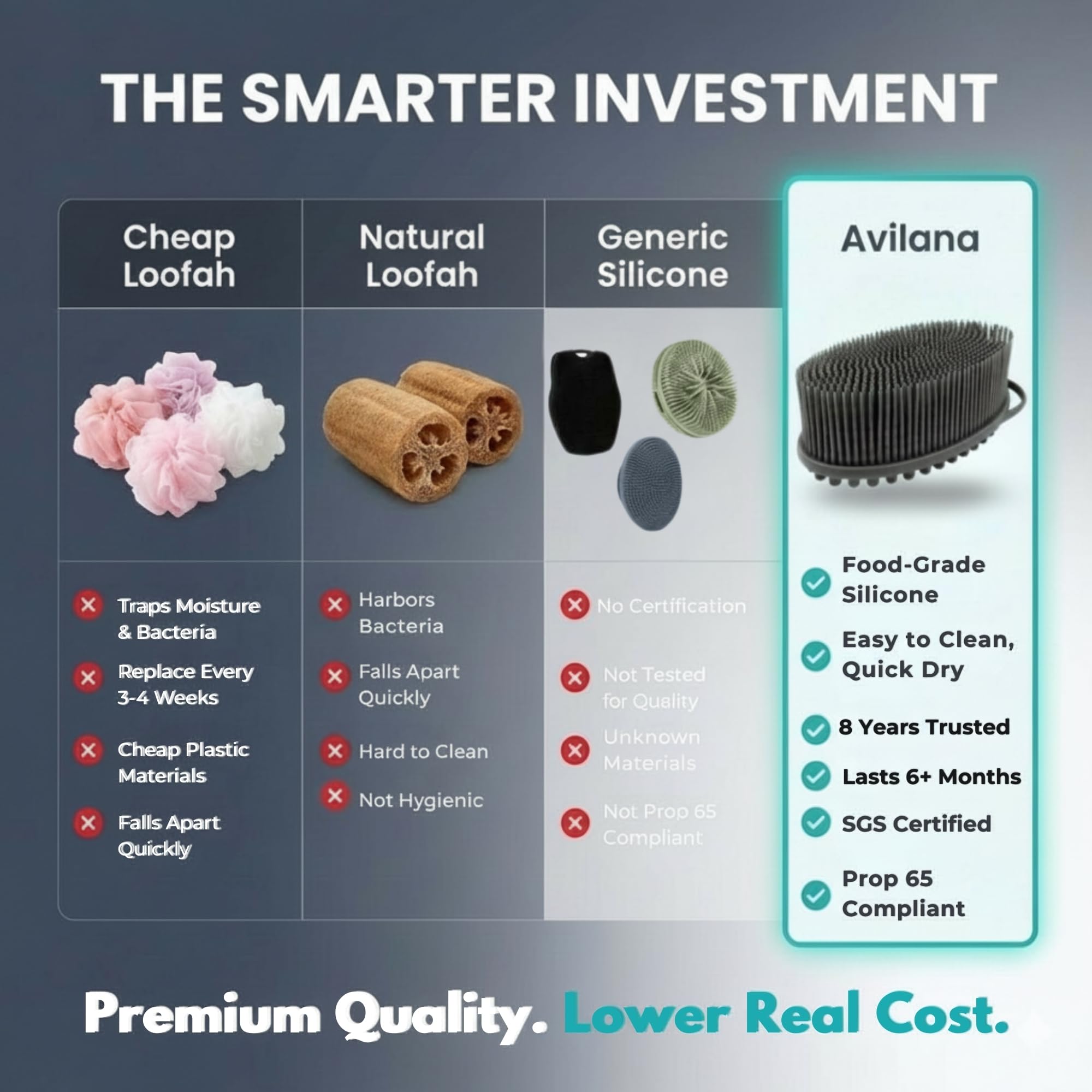 ★ SHOWER SMARTER — WHY PAY MORE? BECAUSE IT COSTS LESS — While $5 scrubbers use mystery materials that develop odors and fall apart within weeks, Avilana delivers SGS-certified, food-grade silicone that stays fresh and performs for 4-6+ months. One Avilana replaces 4-6 cheap scrubbers per year — making your real cost per use far lower. 8 years of trusted quality since 2017.