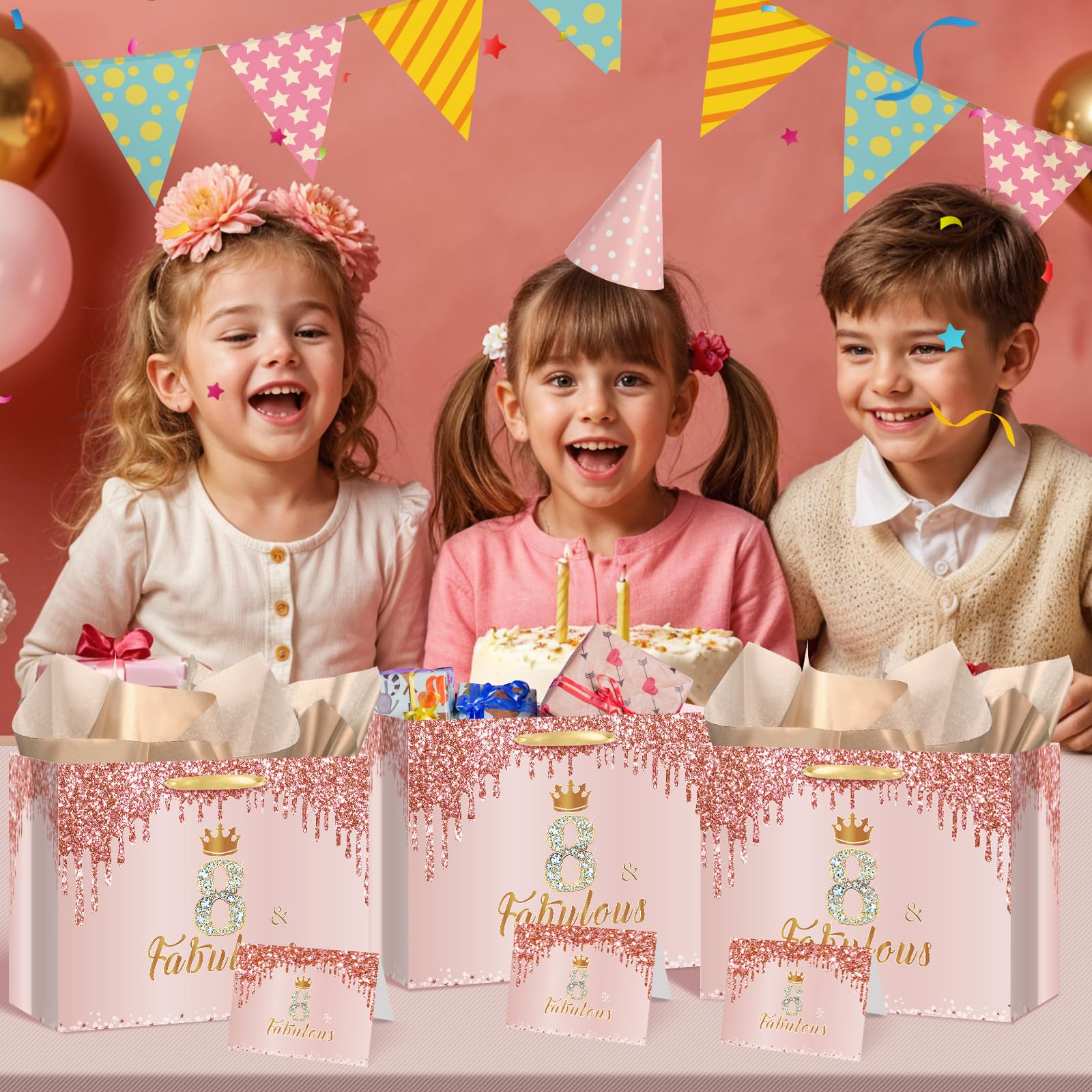đăLarge Size and Durable MaterialăThe large pink 8th birthday gift bag for girls is 11.8"x 9.4"x 5.3", which is big enough to hold most gifts of your choice. The 8th birthday greeting card is 4.7"x 7" and the rose gold 8th wrapping tissue paper is 27.5"x 20". The material of this rose gold 8th birthday wrap bag is thick paper, which is strong and durable.