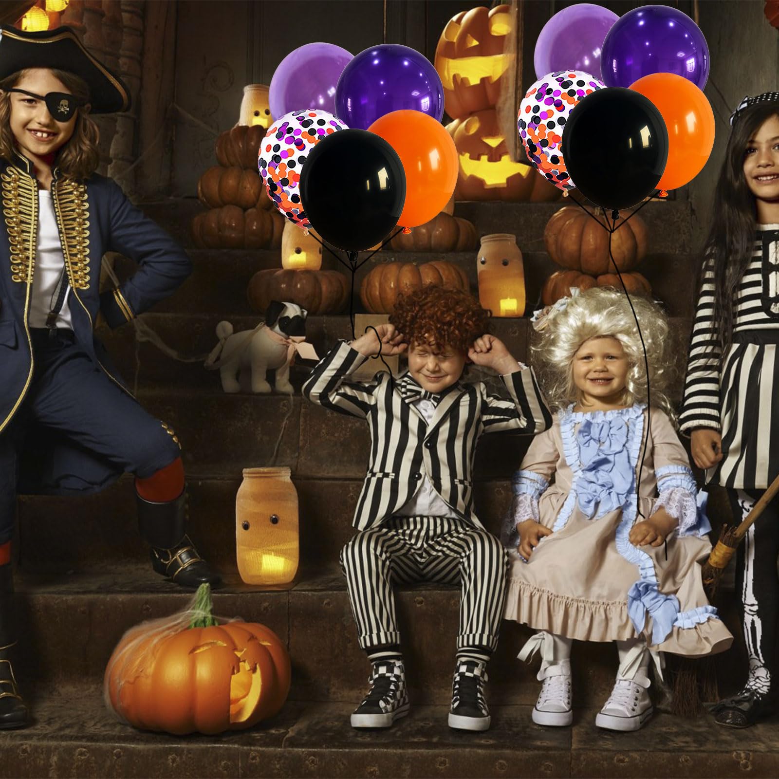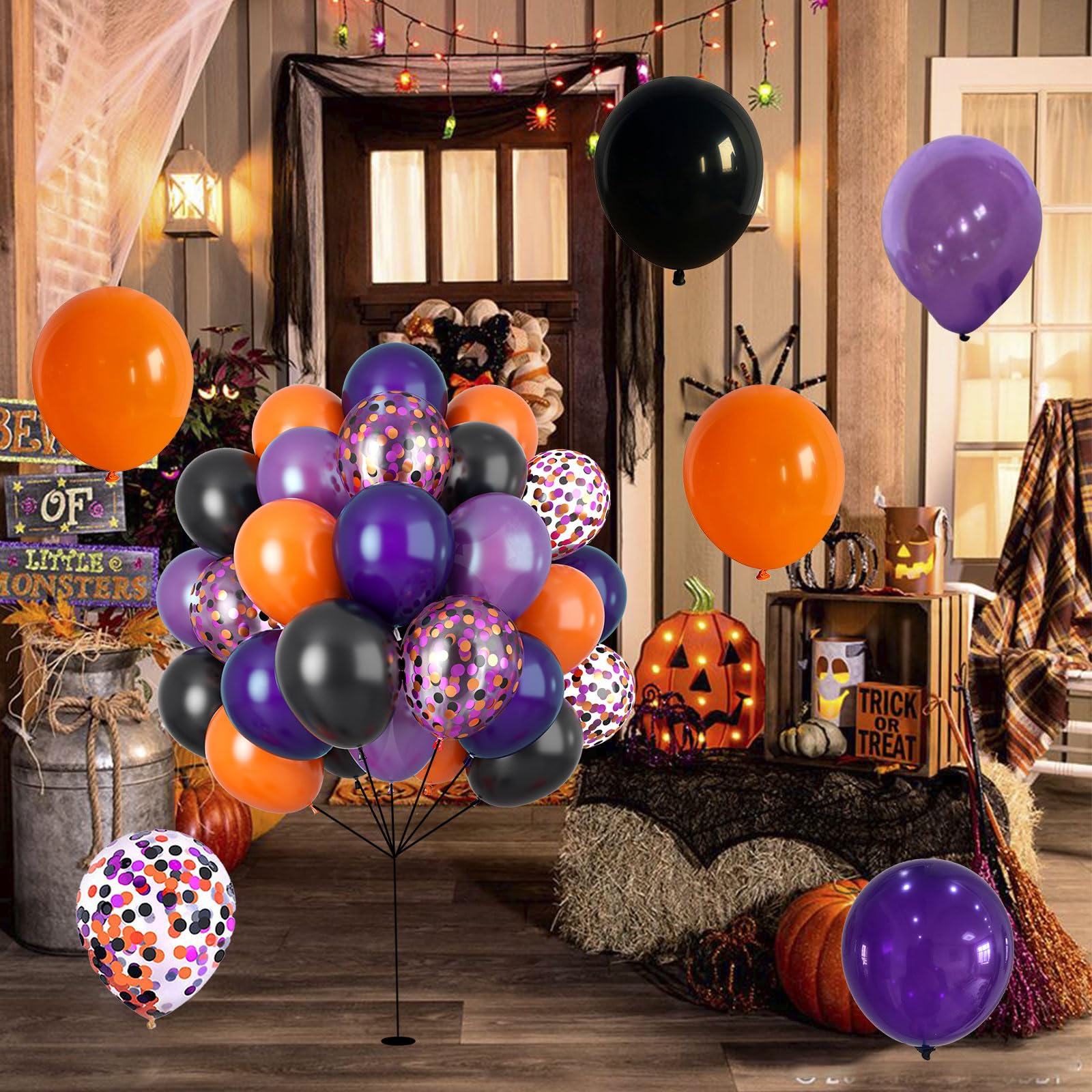 💀 Multiple Applications - Whether you're hosting a Halloween costume party, Halloween party decorations, Halloween birthday party supplies, trick or treat party supplies, spooky ghost theme parties, and haunted house decorations, or simply want to add a touch of Halloween spirit to your home, this black purple orange balloons set is a versatile choice. Hang it on walls, across doorways, or as a stunning table centerpiece.