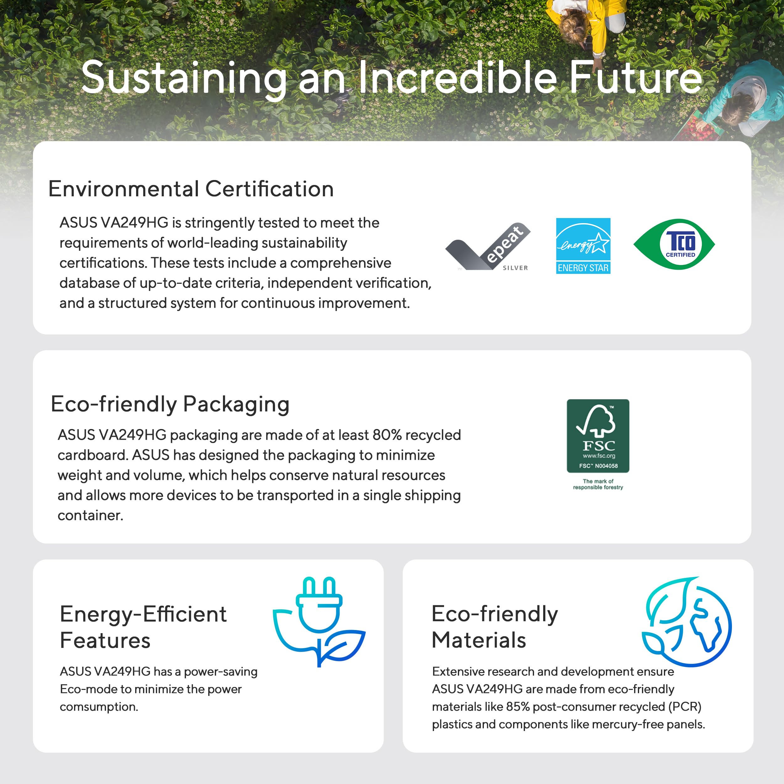 ASUS VA249HG Eye Care Gaming Monitor features 23.8-inch IPS panel with Full HD (1920 x 1080) resolution, providing 178° wide viewing angle panel and vivid image quality. Fast 120Hz refresh rate with Adaptive-Sync technology and 1ms MPRT to eliminate screen tearing and choppy frame rates for the smoother-than-ever experience. It also features TÜV Rheinland-certified Flicker-free and Low Blue Light technologies to ensure a comfortable viewing experience.