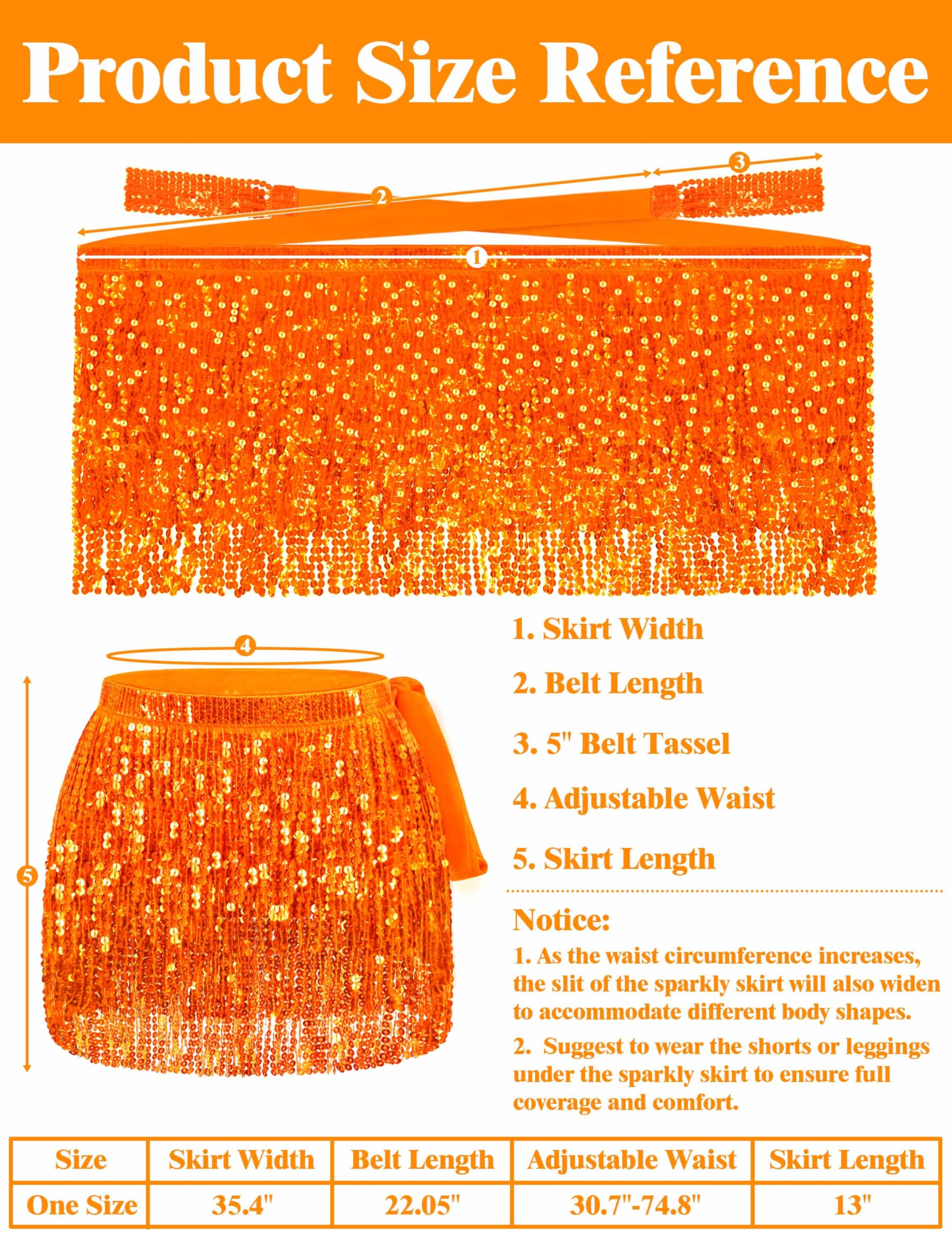 ONE SIZE FITS MOST: The tassle skirt is designed of lacing belt, which allows you to adjust the length of the belt to suit your waistline. The skirt width of belly dancer skirt is about 30.7'', and the waistline of the sequince skirt can be adjusted approximately from 30.7'' to 74.8". The fringe length is 13'', the length of each belt is 22.05'', the length of belt tassel is 5''. As the waist circumference increases, the slit of the skirt will also widen to accommodate different body shapes.
