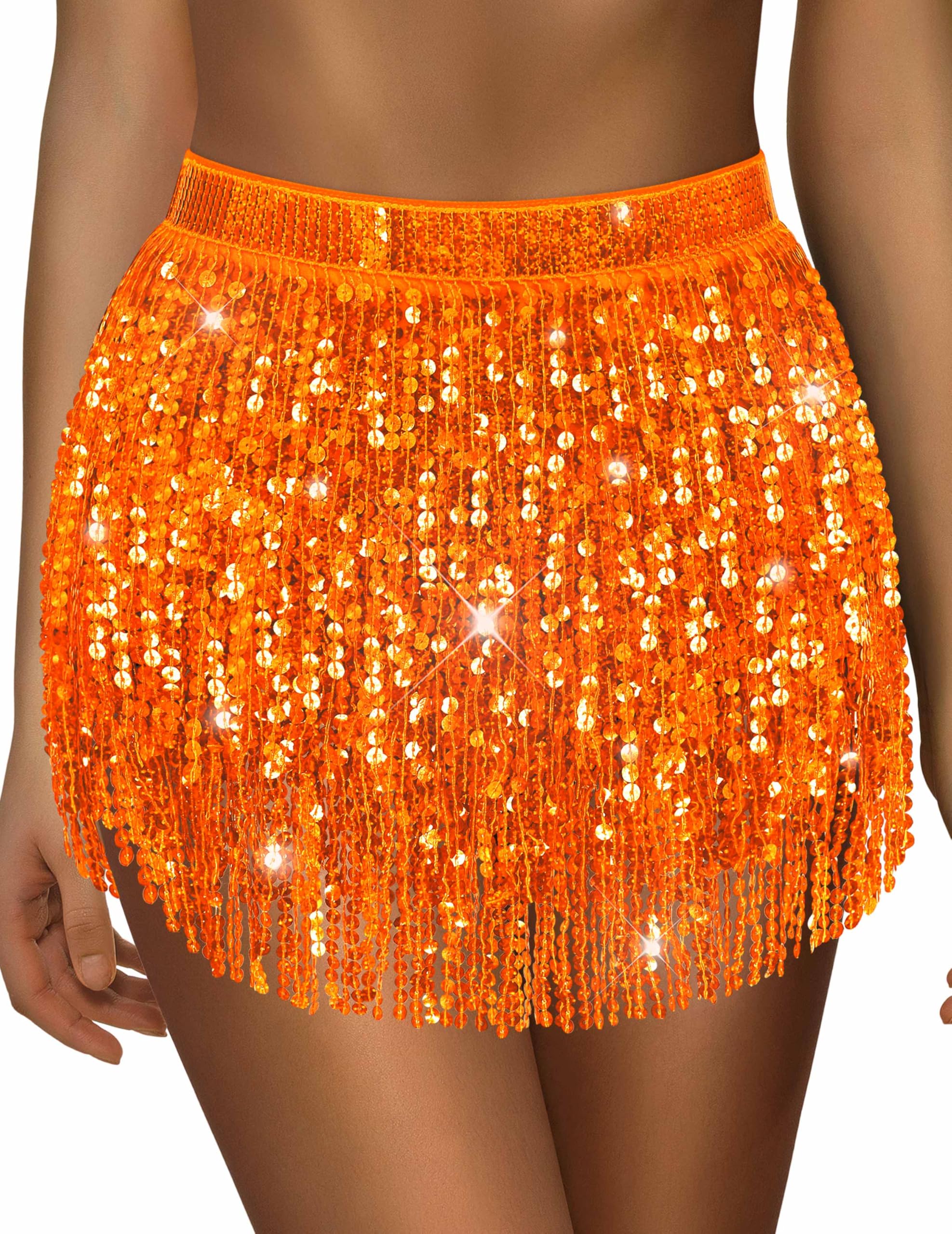 GORGEOUS SEQUINED FRINGE: The belly dance skirt with four-layered sequins and fringes is shinier and more gorgeous, which makes you more acctractive. What's more, the tinsel skirt perfectly fits your curves and showcases your most glamorous side. When you wear this sparkle skirt, people will pay more attention to you and you will be the focus in the crowd.