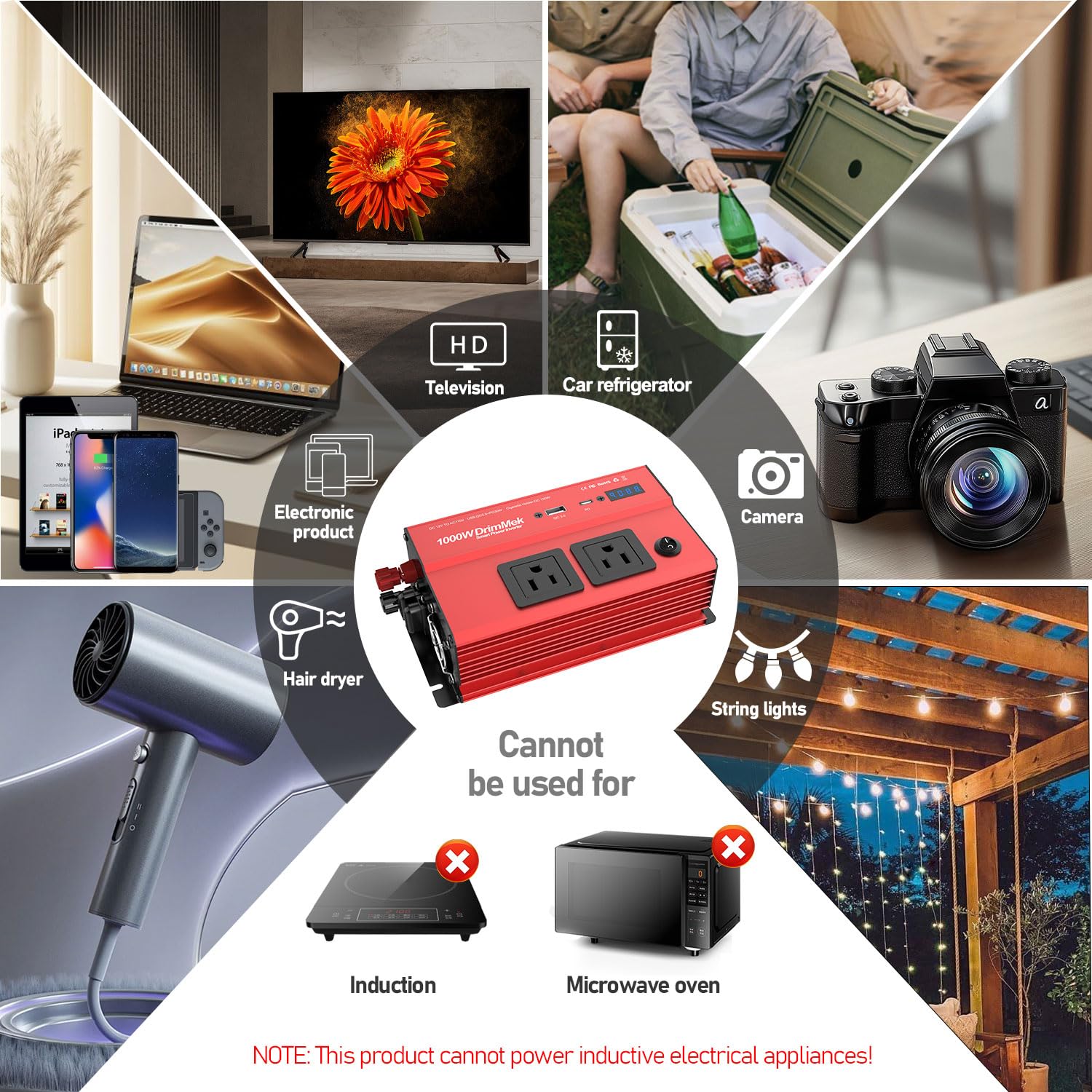 【Power - Packed Performance】: DrimMek 1000w power inverter delivers a stable 1000W of continuous DC - to - AC power, car inverter 12V to 110V.With 2 110V AC outlets, a USB port featuring QC3.0, PD, and 2.4A output, dual 12V Car cigarette lighter inverter and 2 spare 40A Fuses. The intelligent display can automatically detect car temperature, battery power, USB voltage, current