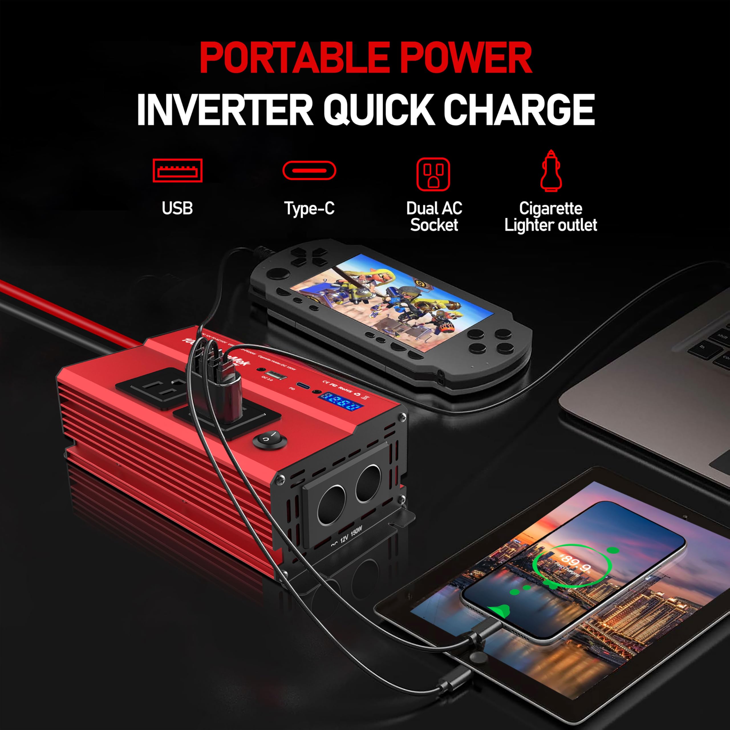 【Portability and Versatility】The size of the car power inverter is 7.67×4×2.4 inches. Featuring a sturdy and durable aluminum shell design, it is capable of withstanding drops and collisions, which adds an extra layer of safety assurance. It is extremely portable and lightweight, weighing only 2.3 pounds.