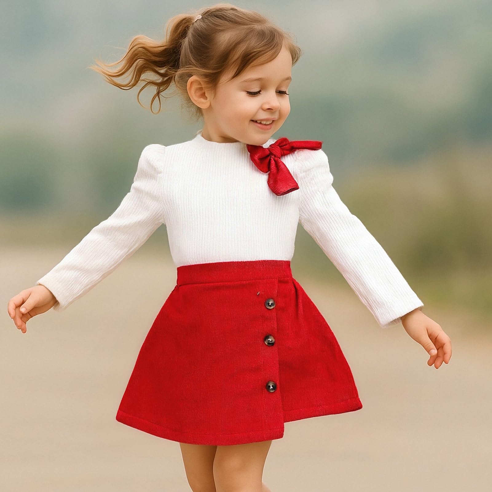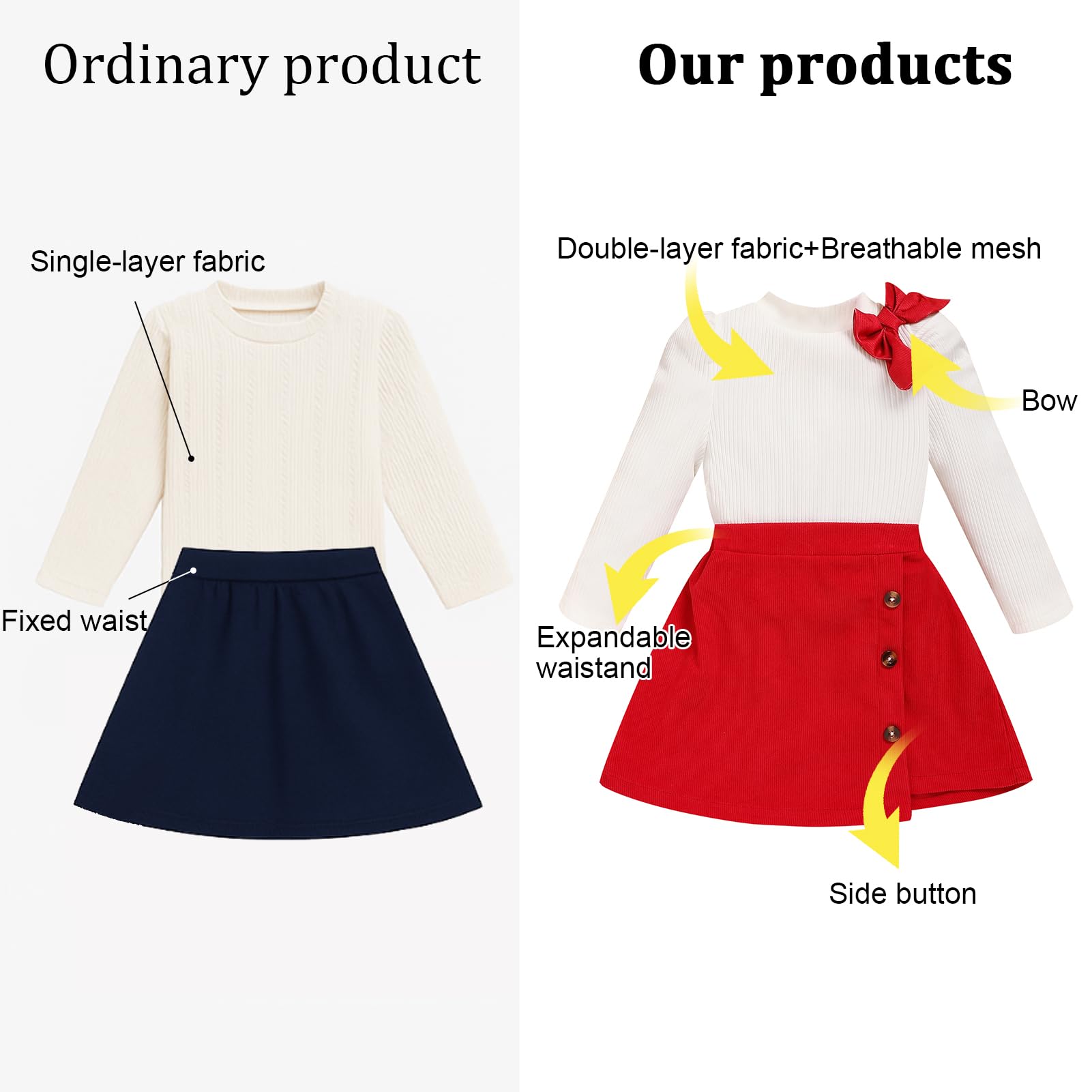 MATERIAL: Toddler girl shirt sweater top is made of cotton and polyester, bottom skirt is made of cotton blend and polyester, soft, breathble, and comfortable, sweet toddler baby girl 2 piece skirt set, cute baby girl clothes.