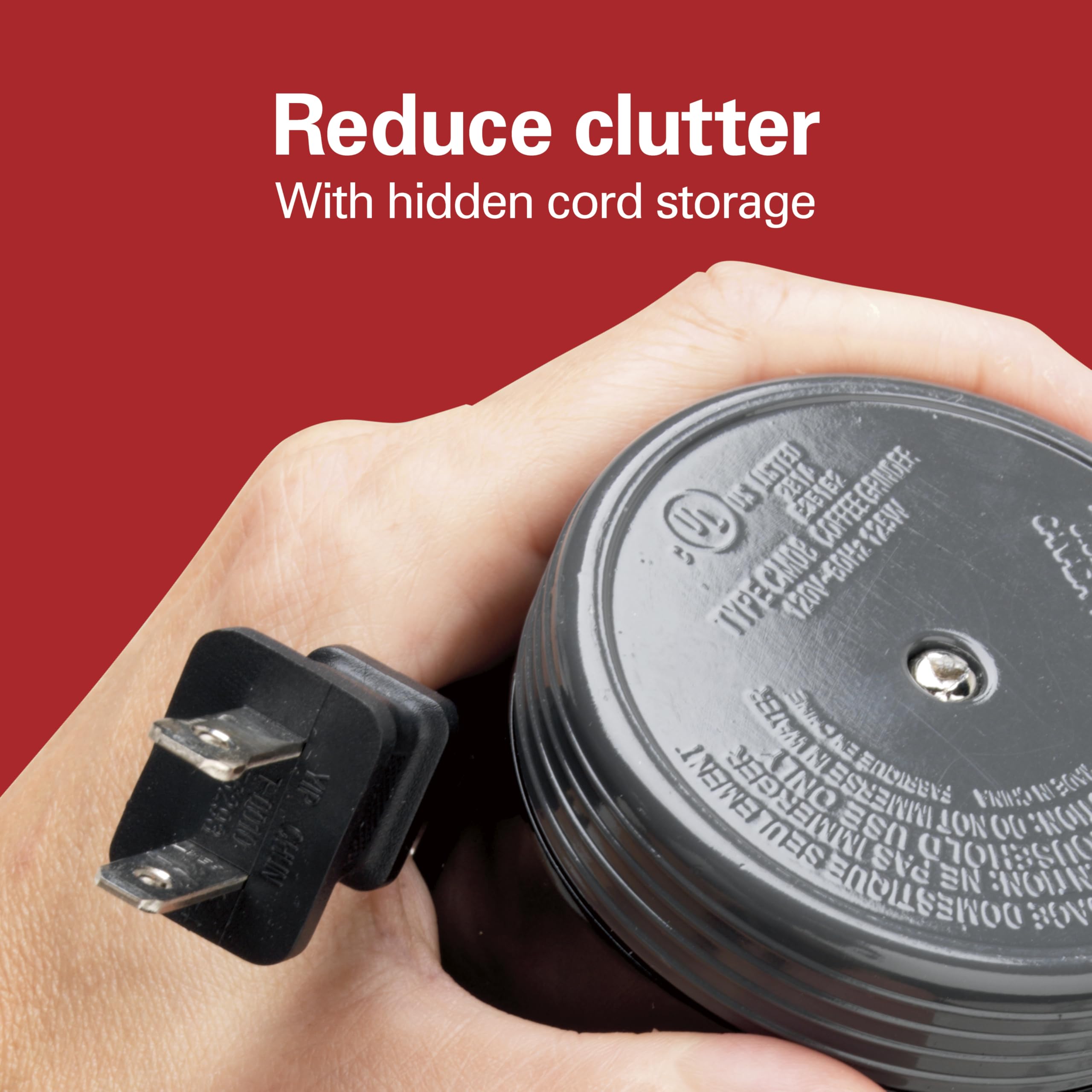 REDUCE CLUTTER WITH HIDDEN CORD STORAGE: Hideaway cord storage under the base keeps cable neat, concealed when not in use; this small coffee grinder is quieter than leading competitor