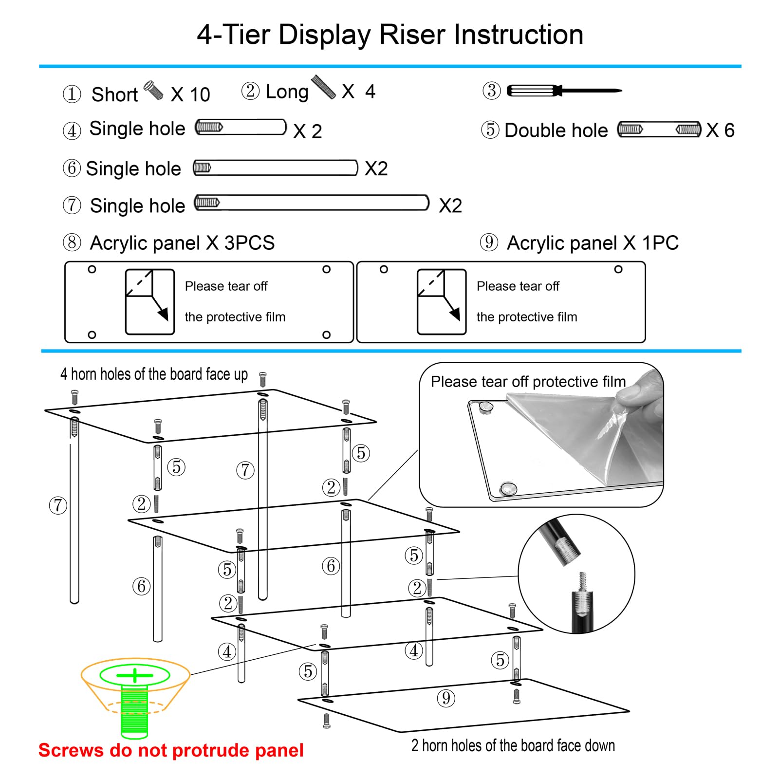 What You Get: 4 tier acrylic stand riser include 1 X 4-tier display stand, 1 X Phillips Screwdriver, 1 X Specification