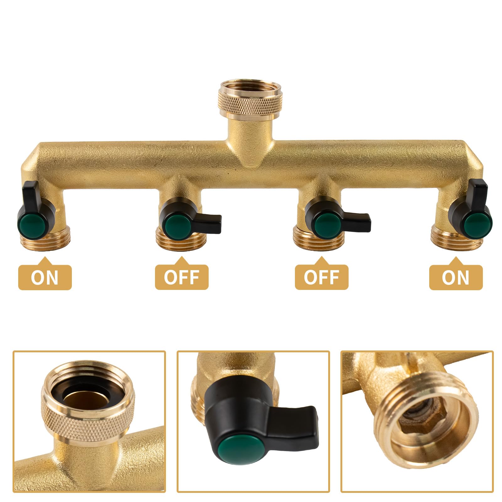 4 Way Hose Spigot Splitter: 4 way hose bib splitter with 4 independent water valve to control flow volume and shut off. Great to connect to automatic watering systems, water timer, controllers for outdoor irrigating/watering.