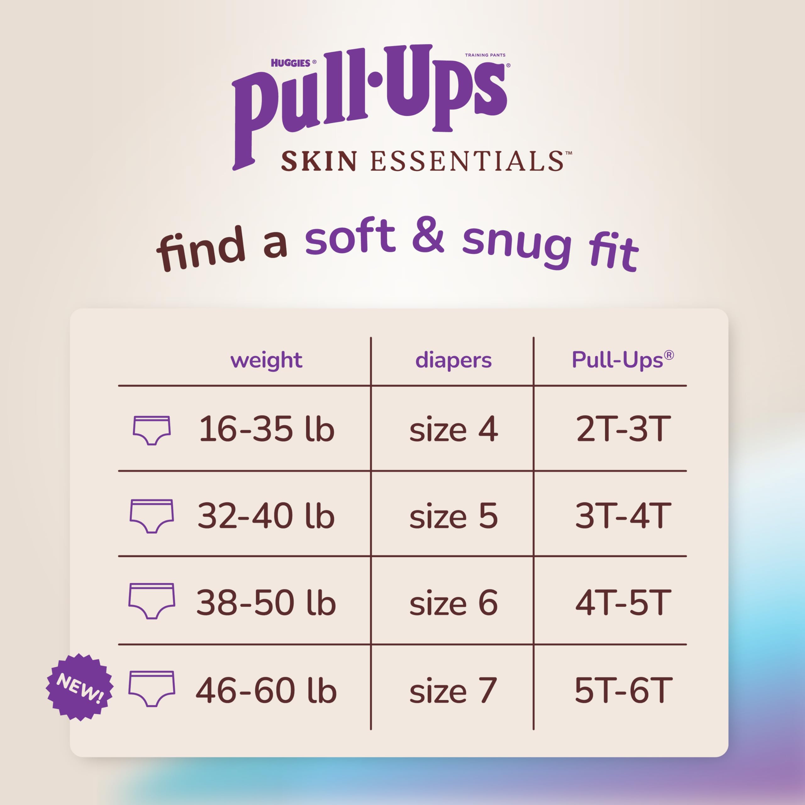 Available in multiple sizes: Pull-Ups Boys' Skin Essentials Training Underwear are available in sizes 2T-3T (16-34 lbs), 3T-4T (32-40 lbs), 4T-5T (38-50 lbs) and 5T-6T (50+ lbs)