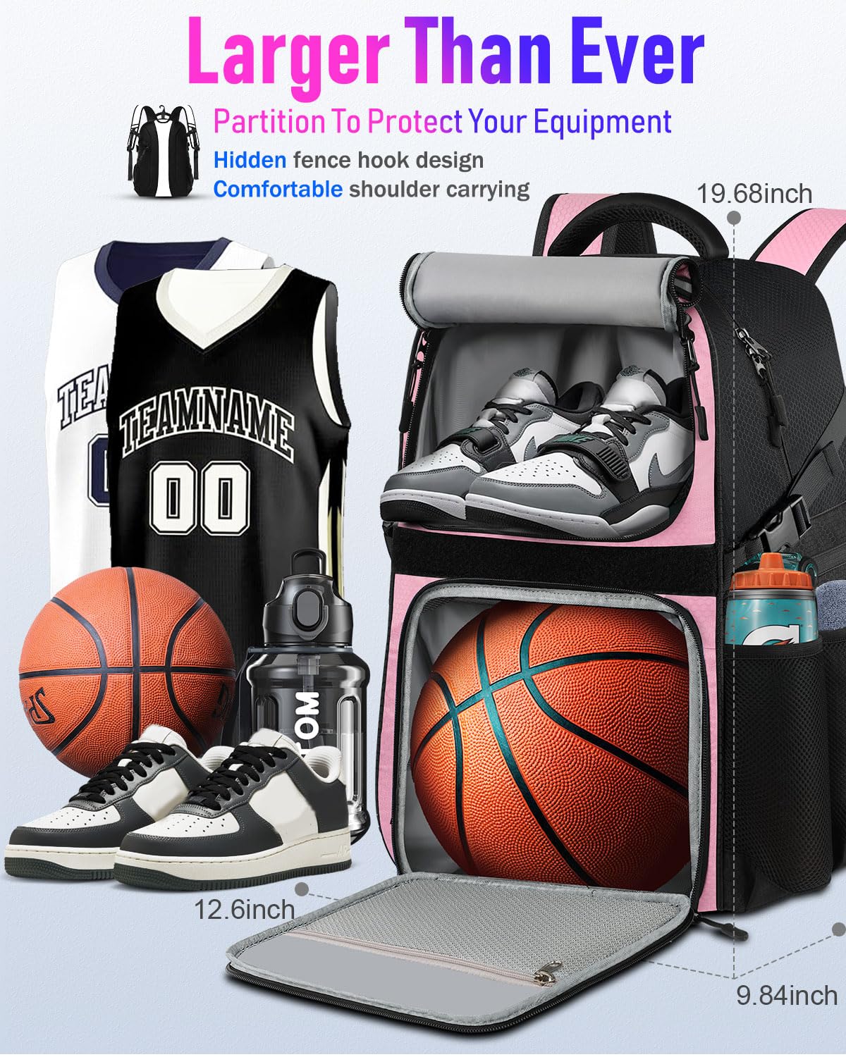 More Space Than Ever Before: LOINTET basketball bag can easily carry your basketball, equipment, basketball and personal belongings. Equipped with 11 storage compartments basketball bag: 1 special compartment for your basketball, 1 main compartment for clothes, 1 breathable compartment for your basketball shoes, 4 side mesh pockets for your water bottle, towel, first aid tools, air pump and other equipment. Additional 4 hidden zipper pockets can store your phone, headphones and other valuables