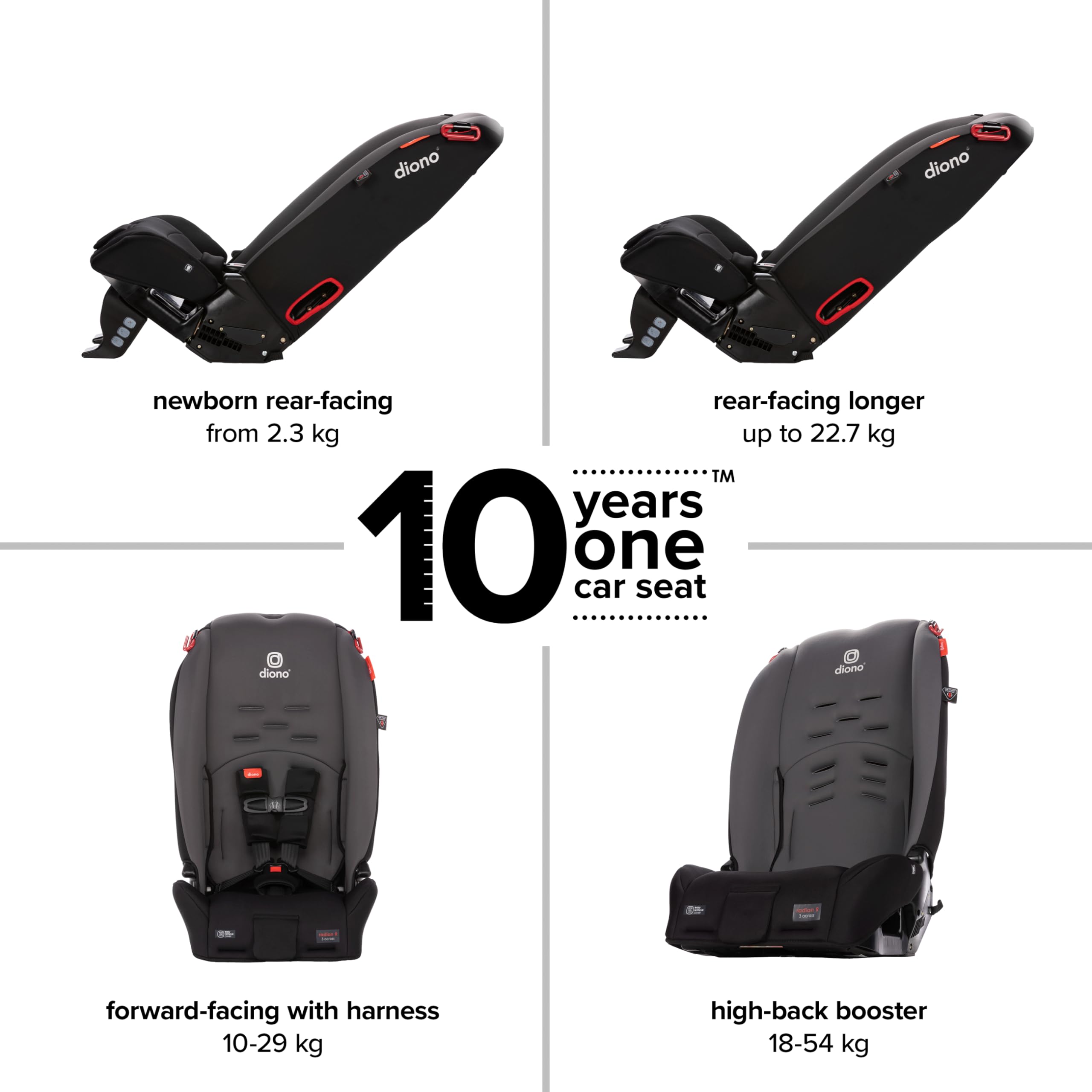10 Years One Car Seat - from Birth to Booster (5 - 120 lb) it's all you will need. Grows with your child, ultimate protection on every road trip. 4 modes in 1 seat!