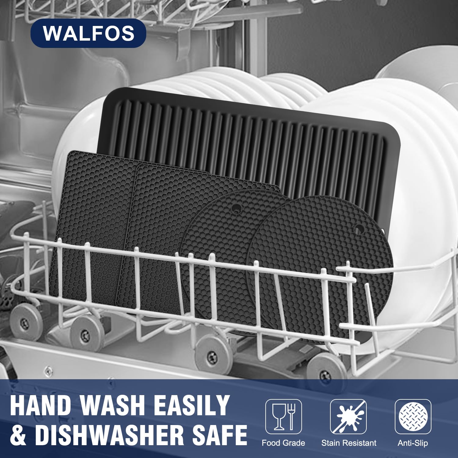 Walfos Silicone Trivet Mat have many advantage. √Food Grade silicone,. √Heat resistant up to 446°F. √Will never melt, discolored, or shrink. √Easy to clean and dishwasher safe. √Dry fast with no residue