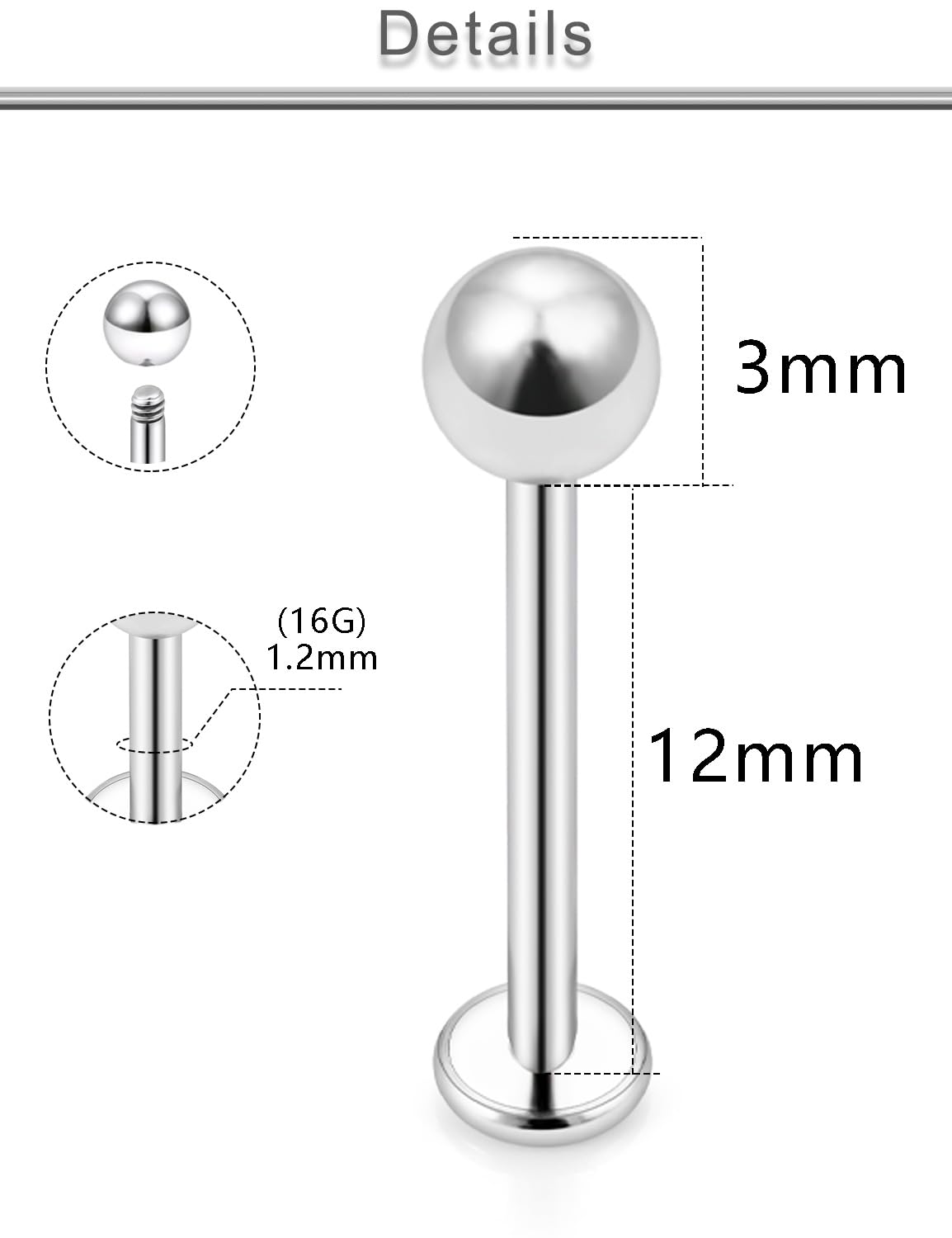 Silver Long Lip Rings Studs Gauge: 16G(1.2mm), Bar Length: 1/2"(12mm); Ball Size: 3mm.