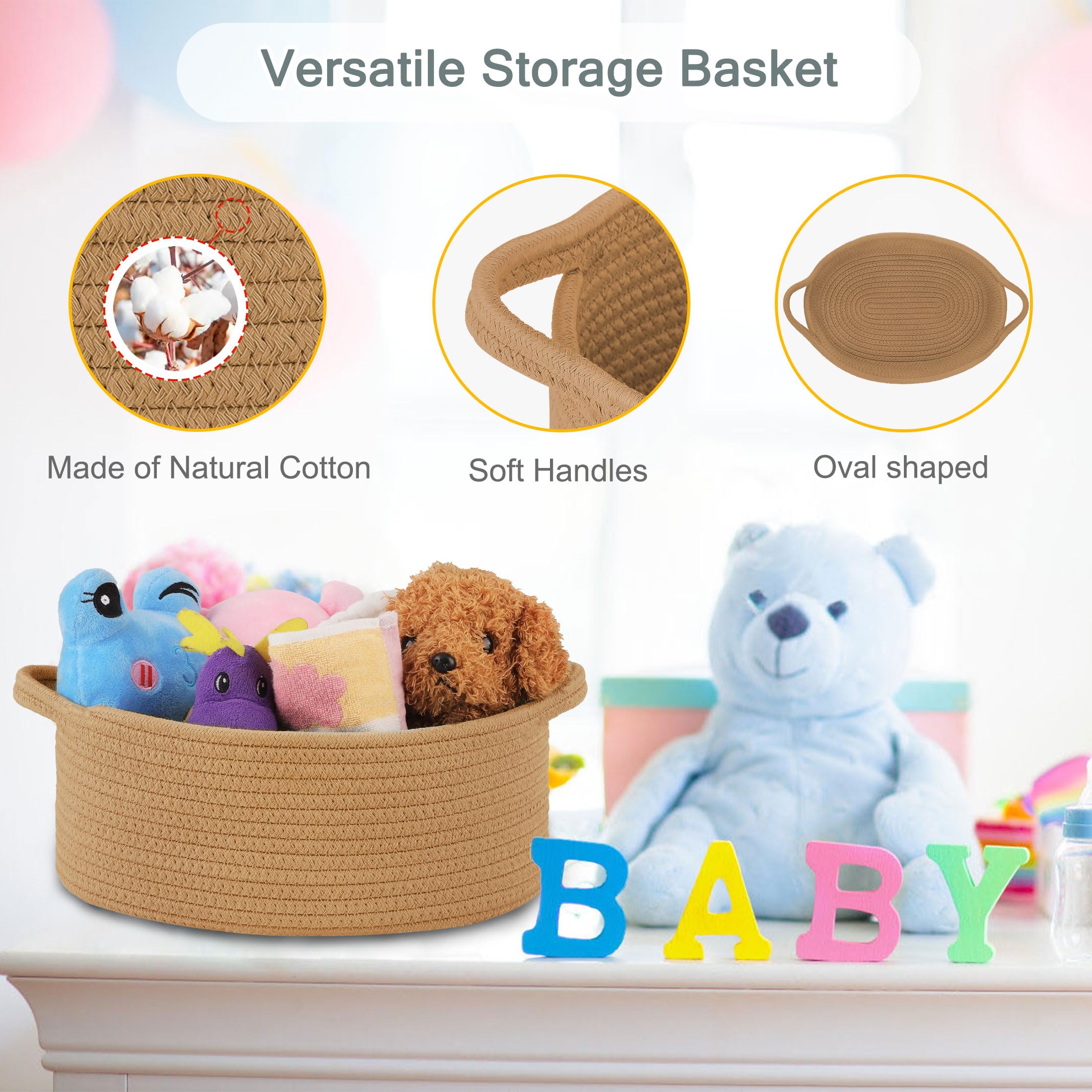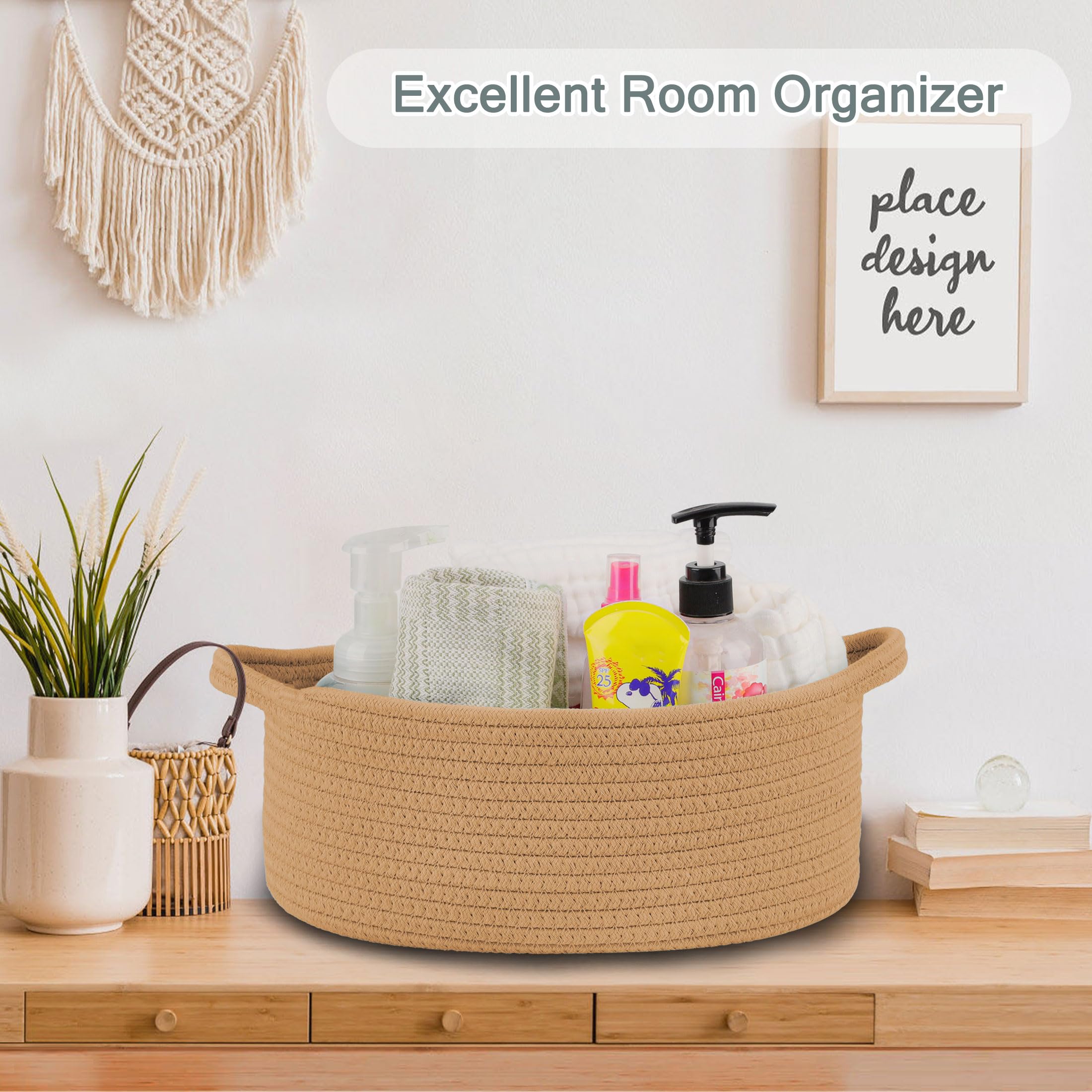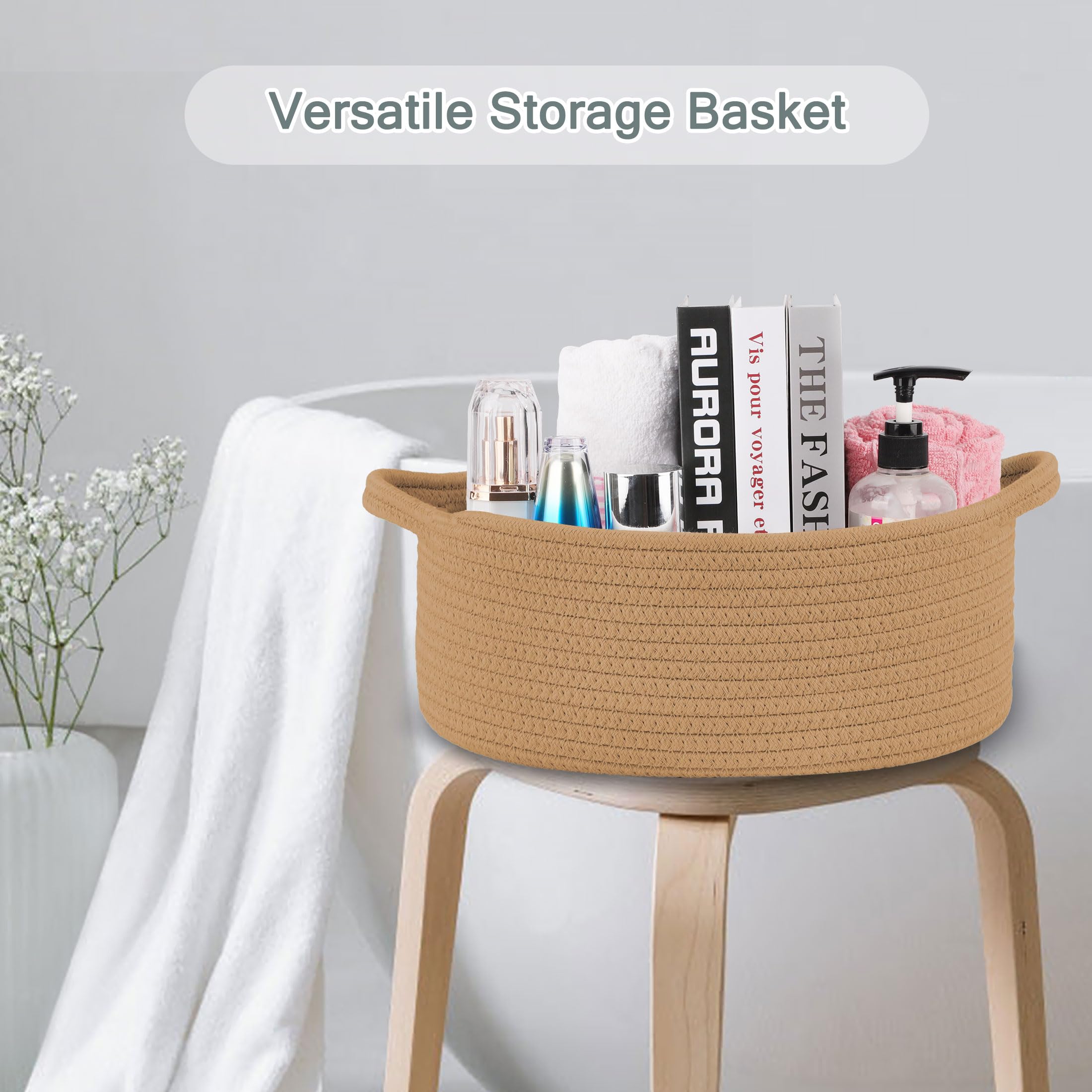 【Versatile Storage Basket】 Our rope storage basket is the perfect organizer for keys, wallets, diapers, books, remotes, toys, makeups, and more. You can use it as a baby basket, end table basket, shelf storage basket, office desk basket, basket for bathroom, kids' toy basket, book basket, shallow basket, and more. It can also be used as a pet toy basket for cats and dogs.