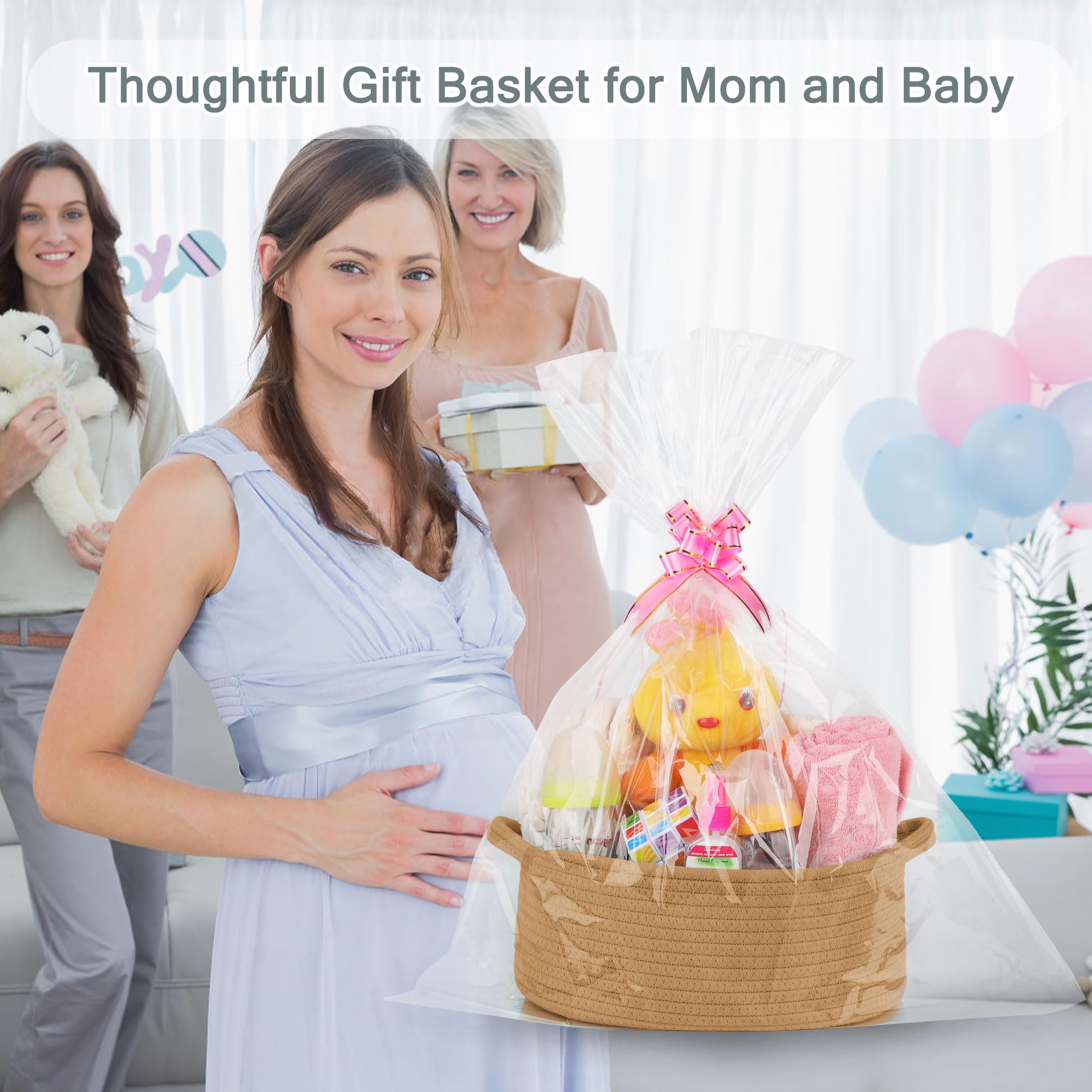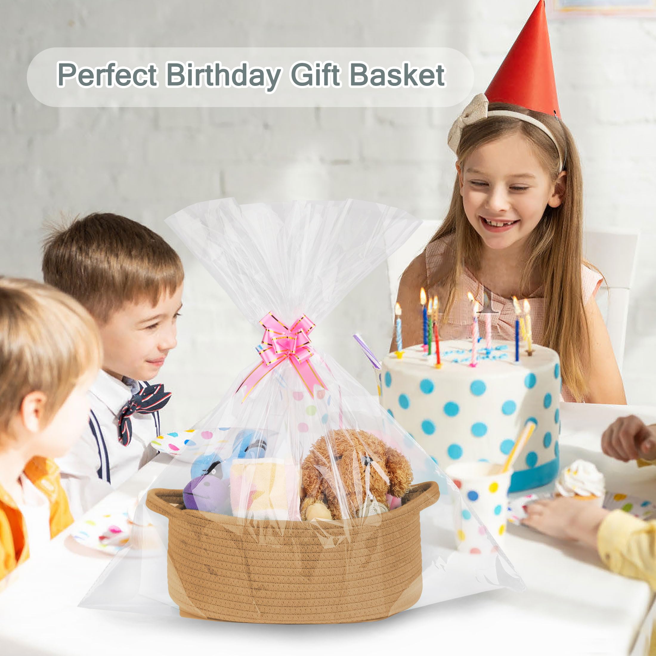 【Best Gift Options】 Our woven gift basket comes with one clear cellophane bag and three ribbons of different colors, which is very convenient for making gifts. It is a perfect choice for Birthdays, Baby Showers, Mother's Day, Father's Day, Valentine's Day, Graduation Gifts, Easter and Christmas. This small storage basket itself is a great gift.