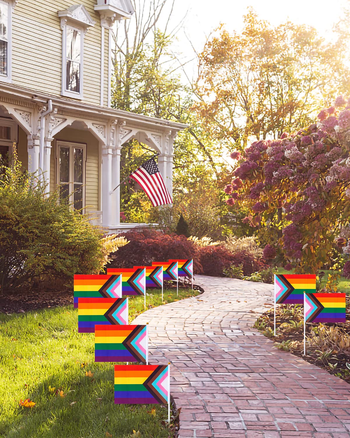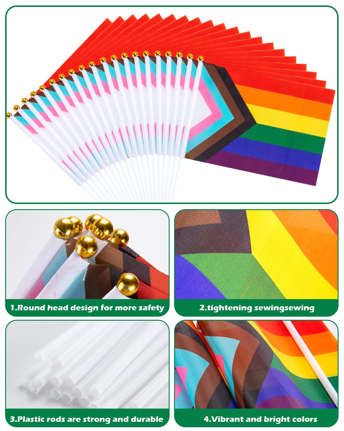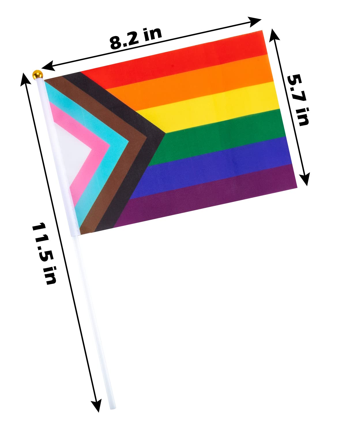 šćPremium Quality & DurabilityćCrafted from high-quality polyester, these Progress Pride flags are designed to last. The fabric features vibrant, fade-resistant colors, while the sturdy 11.5-inch white plastic rods ensure they stay firmly attached. They are easy to assemble and strong enough to wave all day at parades or events.
