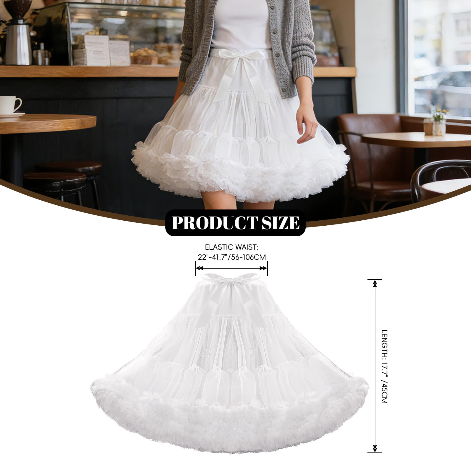 Size: Waist circumference: 22-41.7 inches (56-106cm).The length of the skirt is 17.7 inches (45 cm). Can be worn alone or used as a skirt support.