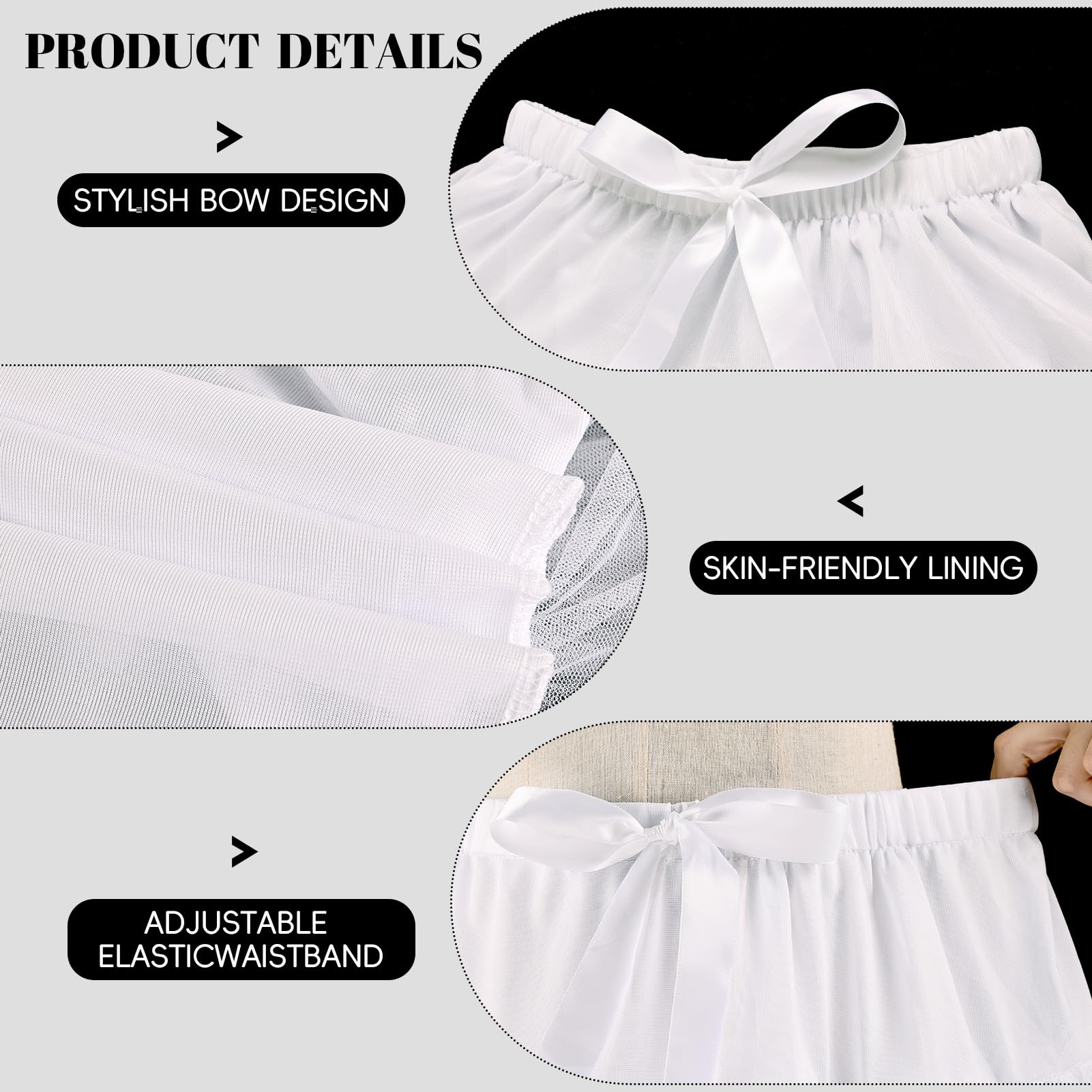 Material: The petticoat skirt is made of polyester, with 2 layers of tulle and 1 layer of soft lining. The waist of the tulle skirt can be adjusted.Satin ribbon bow at waist outside is just for decoration