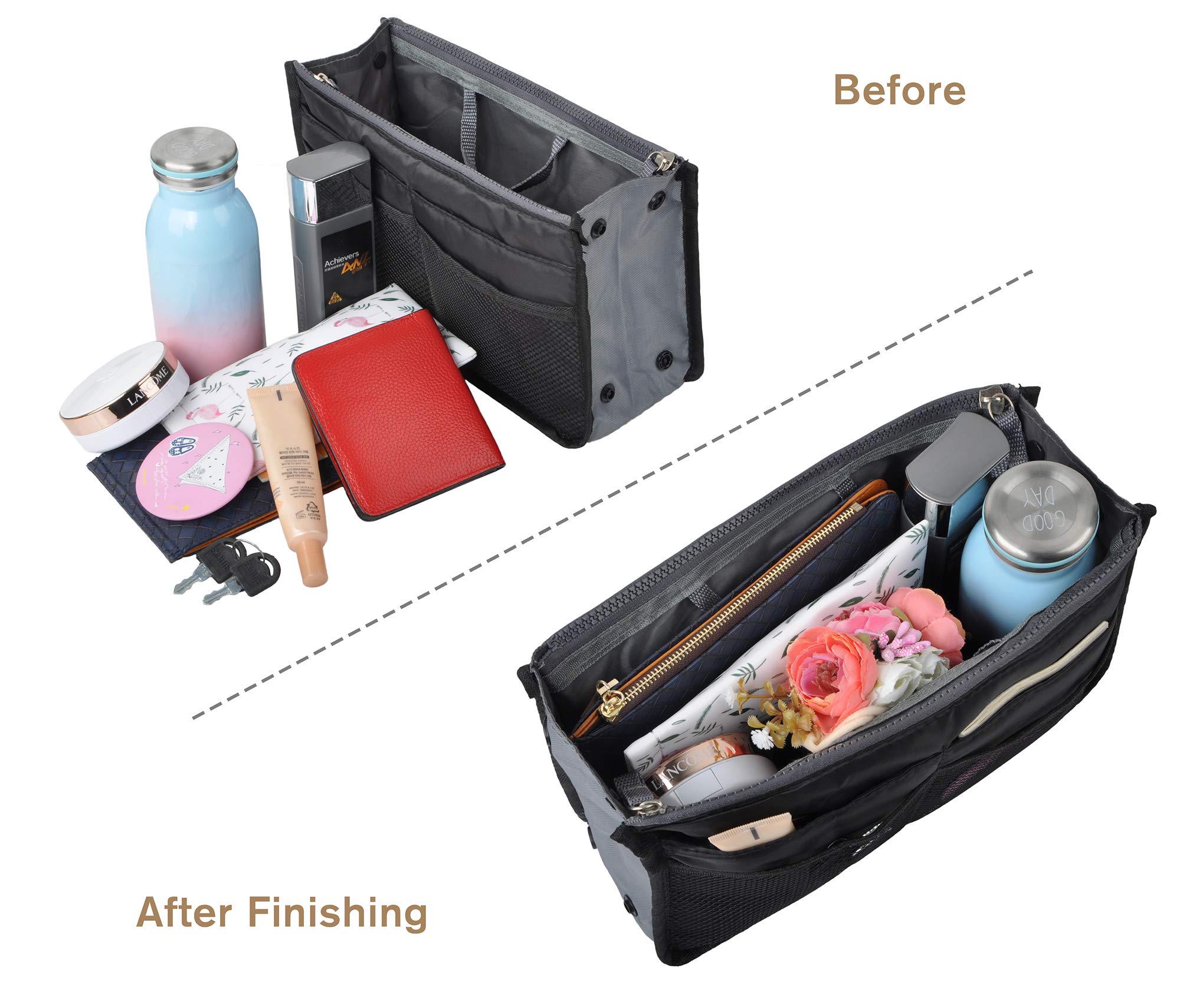 Thses purse insert organizers' two sides have snap buttons, adjust space and help hold things inside, also, help to fold up when not in use. Two handles make it easier and more convenient to transfer between bags. Good companion for all your purses, handbags, totes, bags, pocketsbooks, etc.