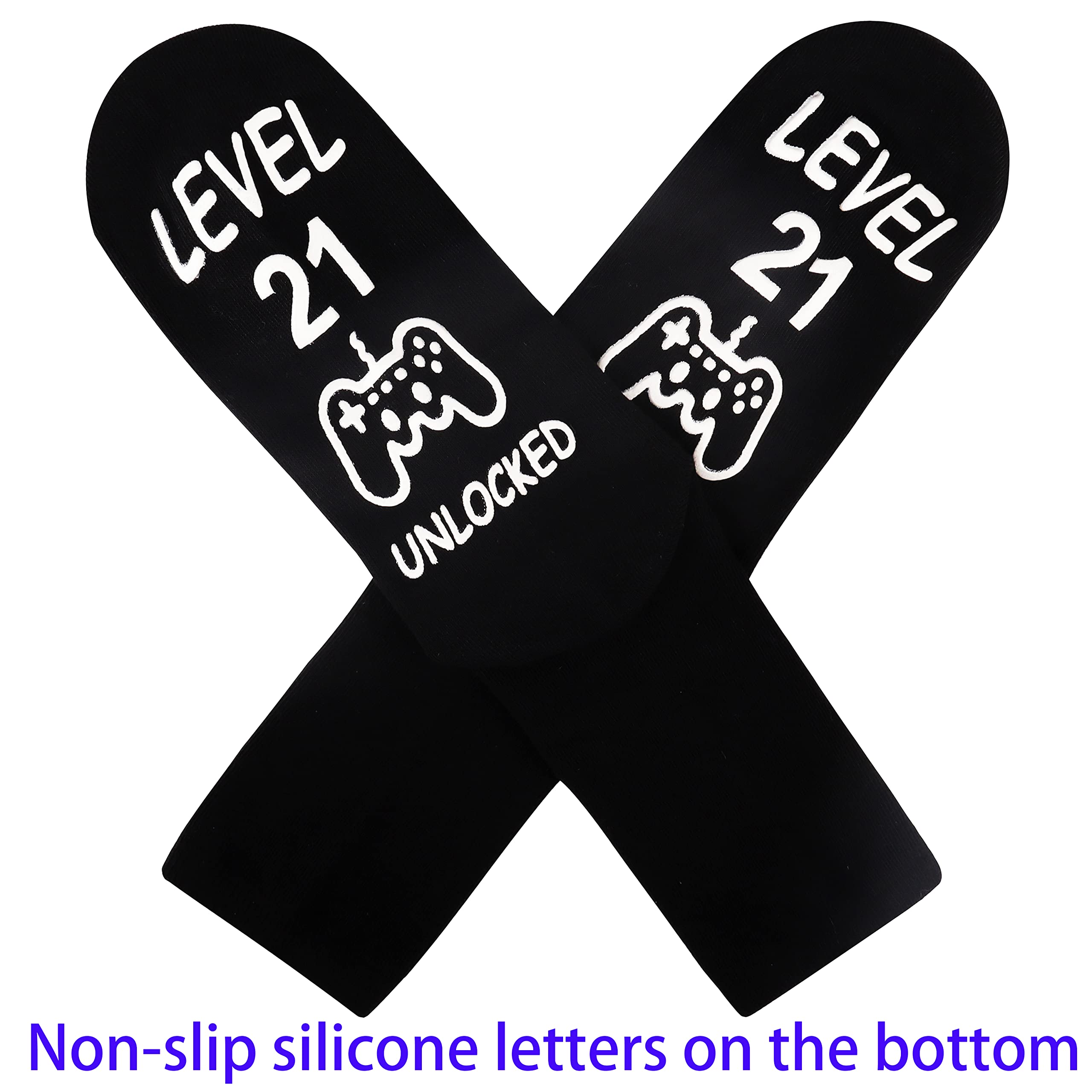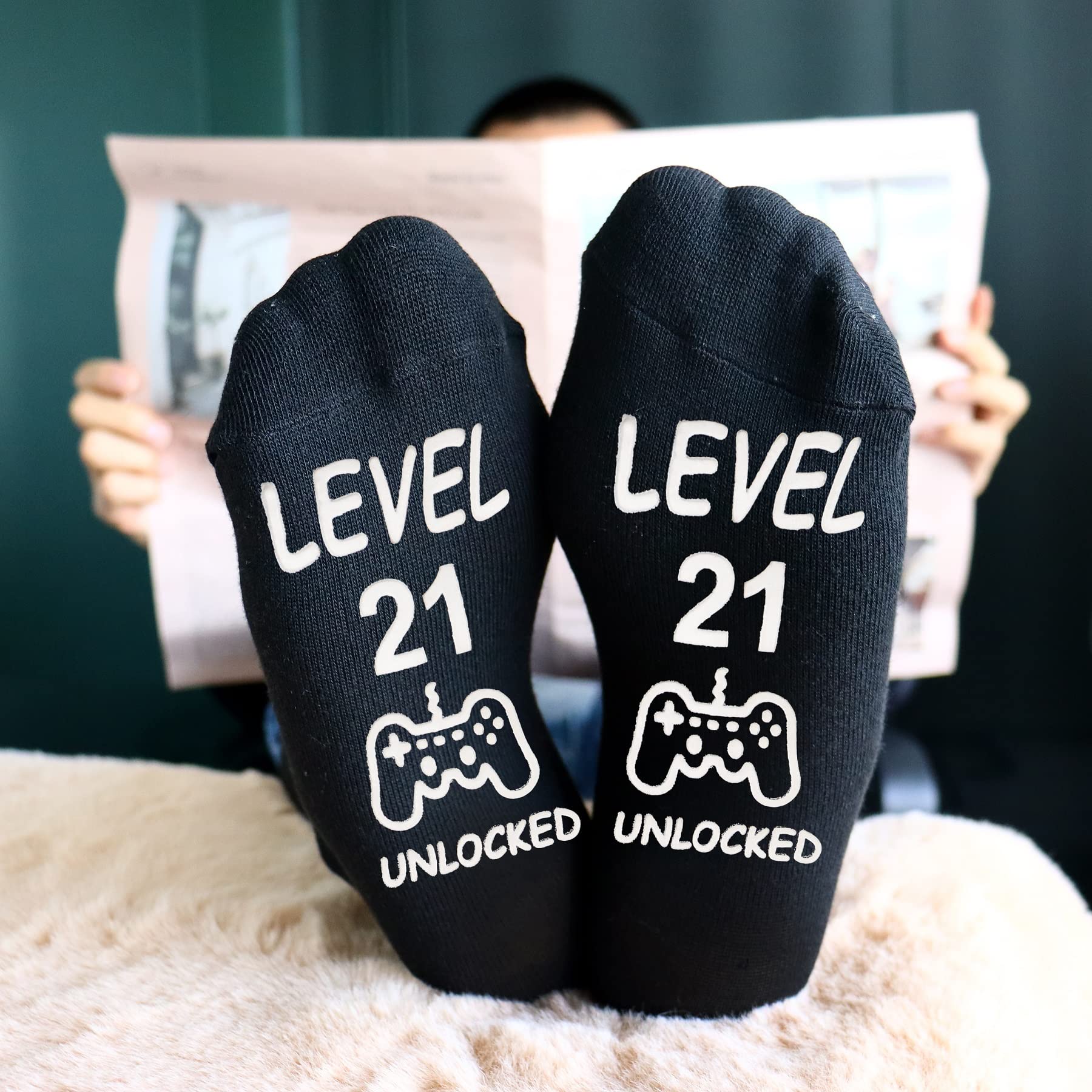 Funny Design: “LEVEL 21 UNLOCKED ” with game-pad printed on these black crew socks. Put on these fun socks, your boys would have a great day.