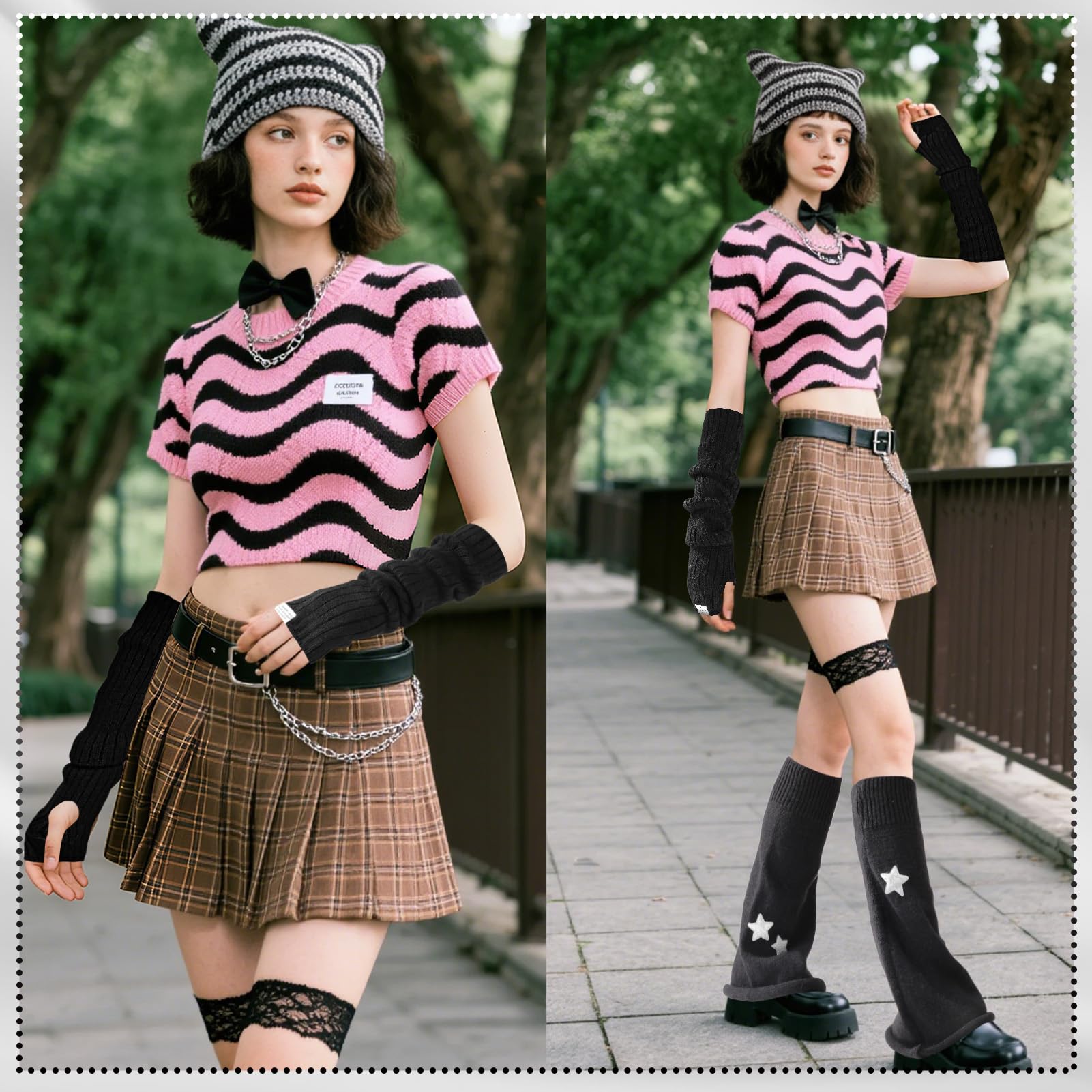 Perfect Gift-Ready Set: Goth stretchy accessories set Includes both retro arm and leg warmers and emo beanie in one stylish bundle. An ideal gift for birthdays or holidays—delight any fashion-forward woman or teen girl