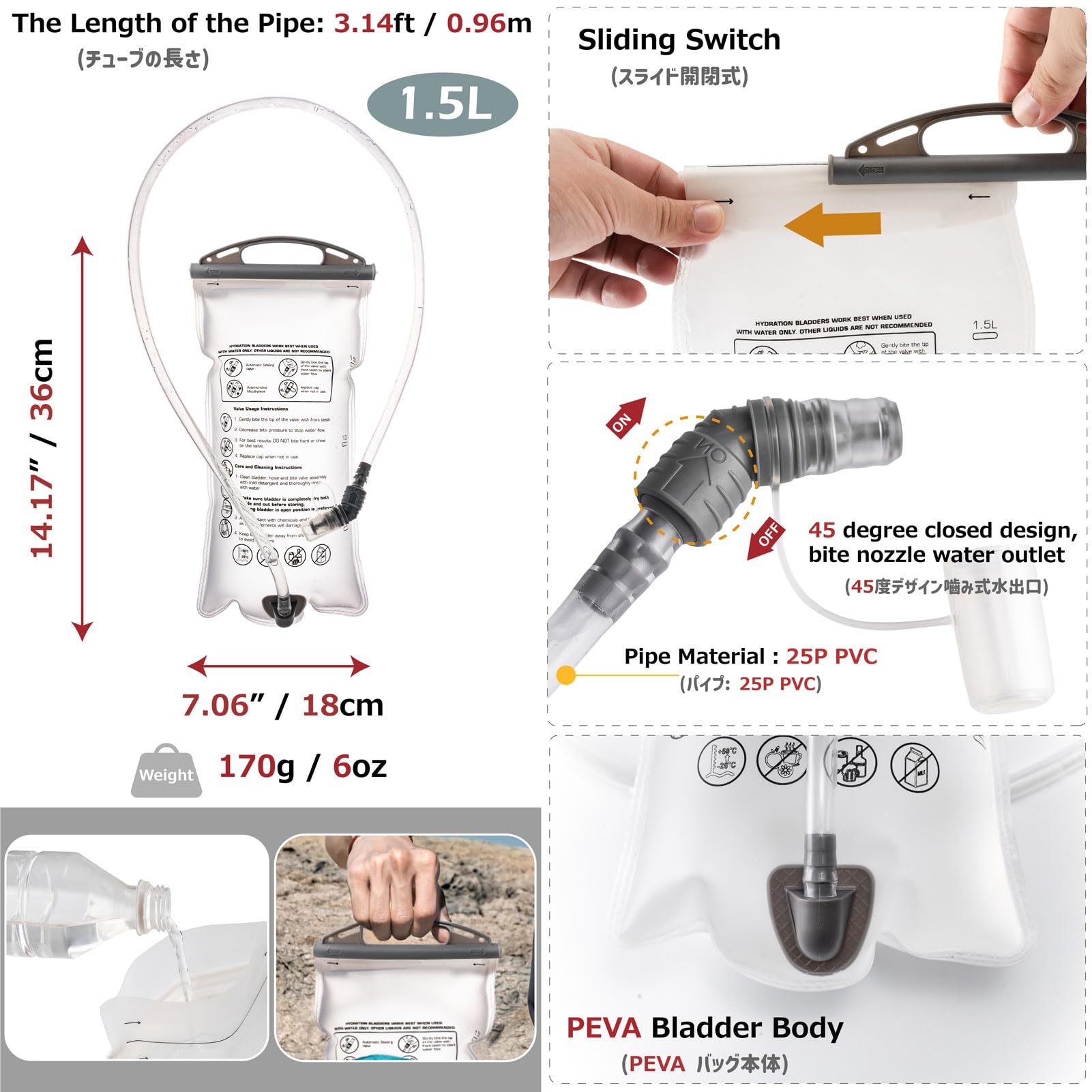 Hydration Bladder: Includes a 1.5L BPA-free PEVA bladder weighing only 6 oz (170 g). Designed with pressure resistance and leak-proof performance to keep you hydrated on hikes, cycling, running, and other outdoor adventures