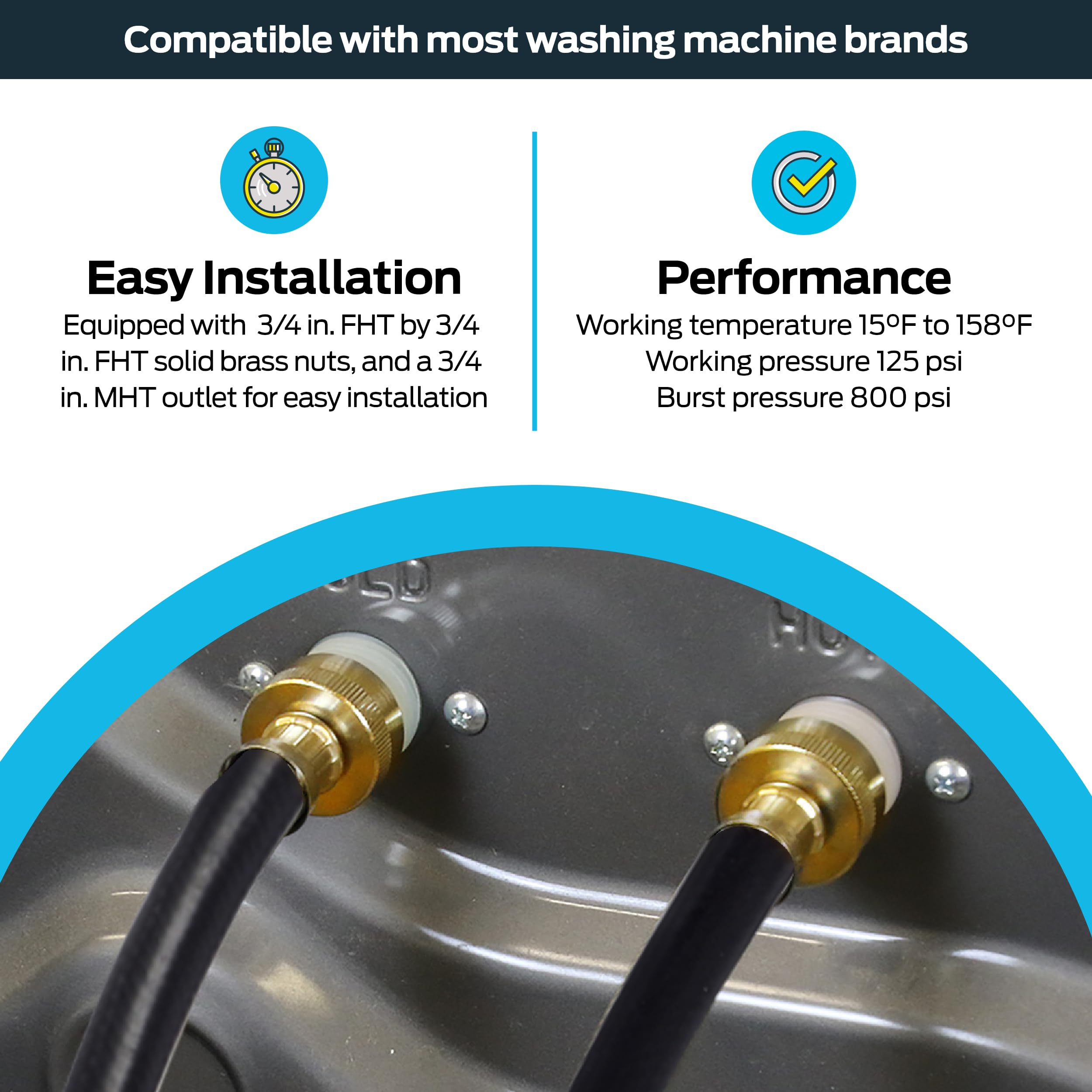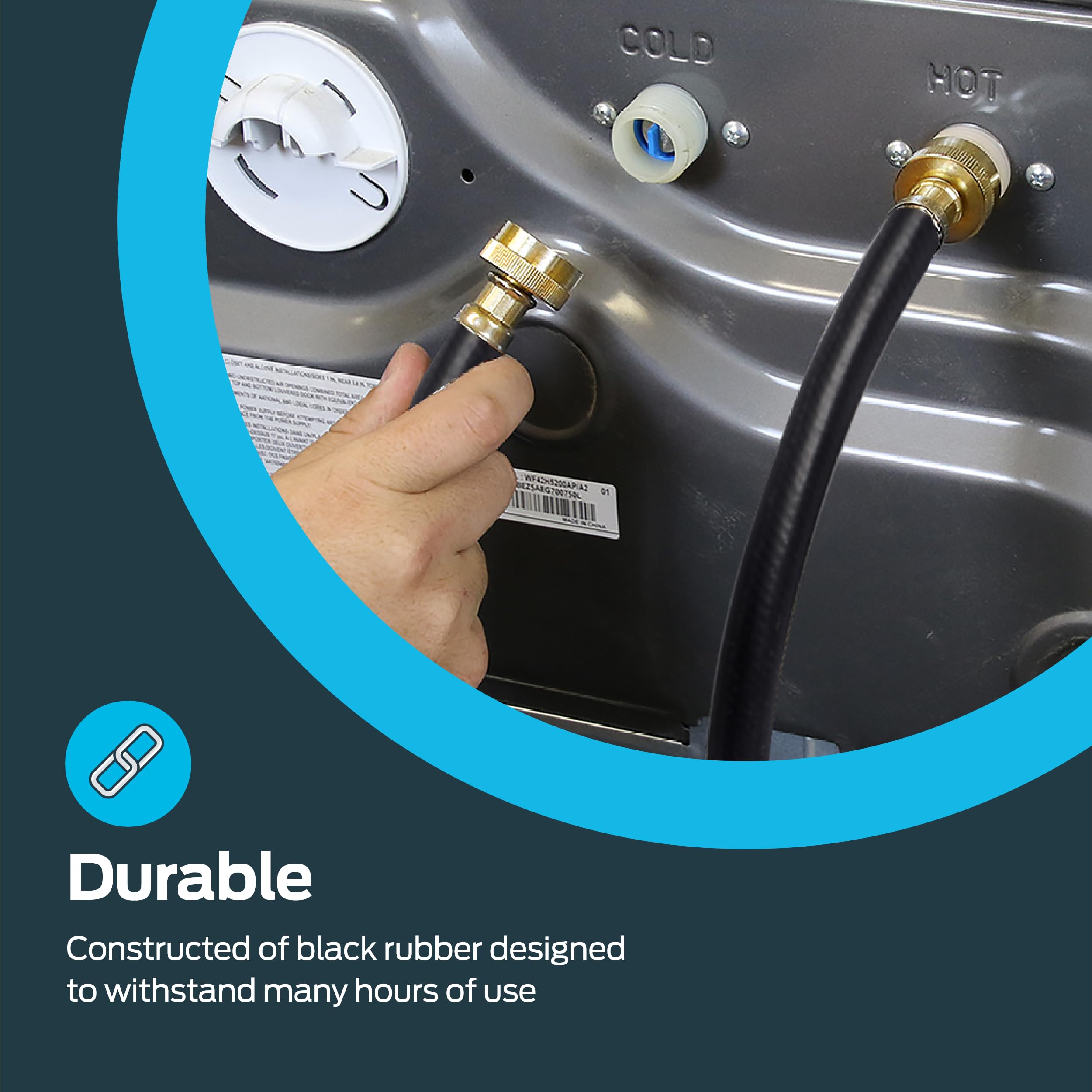 UNIVERSAL FLEXIBLE WASHING MACHINE CONNECTOR: This 1 ft. rubber washing machine Y-mixer hose is equipped with brass ends and dual 3/4 in. FHT connections on one end and 3/4 in. MHT on the other. Used to connect a single water supply to both the hot and cold inlets of a washing machine