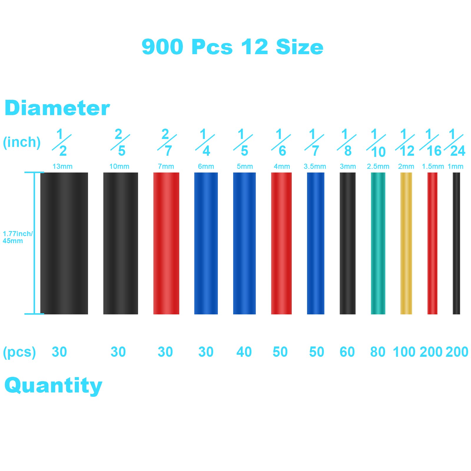 900 PCS WIRE HEAT SHRINK TUBING KIT LINED: 2:1 Industrial heat-shrink tubing for wires include: 1/24 (1.0mm) 200 pcs, 1/16 (1.5mm) 200 pcs, 1/12 (2.0mm) 100 pcs, 1/10 (2.5mm) 80 pcs, 1/8 (3.0mm) 60 pcs, 1/7 (3.5mm) 50 pcs, 1/6 (4mm) 50 pcs, 1/5 (5mm) 40 pcs, 1/4 (6mm) 30 pcs, 2/7 (7mm) 30 pcs, 2/5 (10mm) 30 pcs, 1/2 (13mm) 30 pcs, length: 1.77 inch(45 mm), total 900 pcs, 12 Sizes, 6 Colors. Our colored marine heat shrink tubing satisfied for your different need.