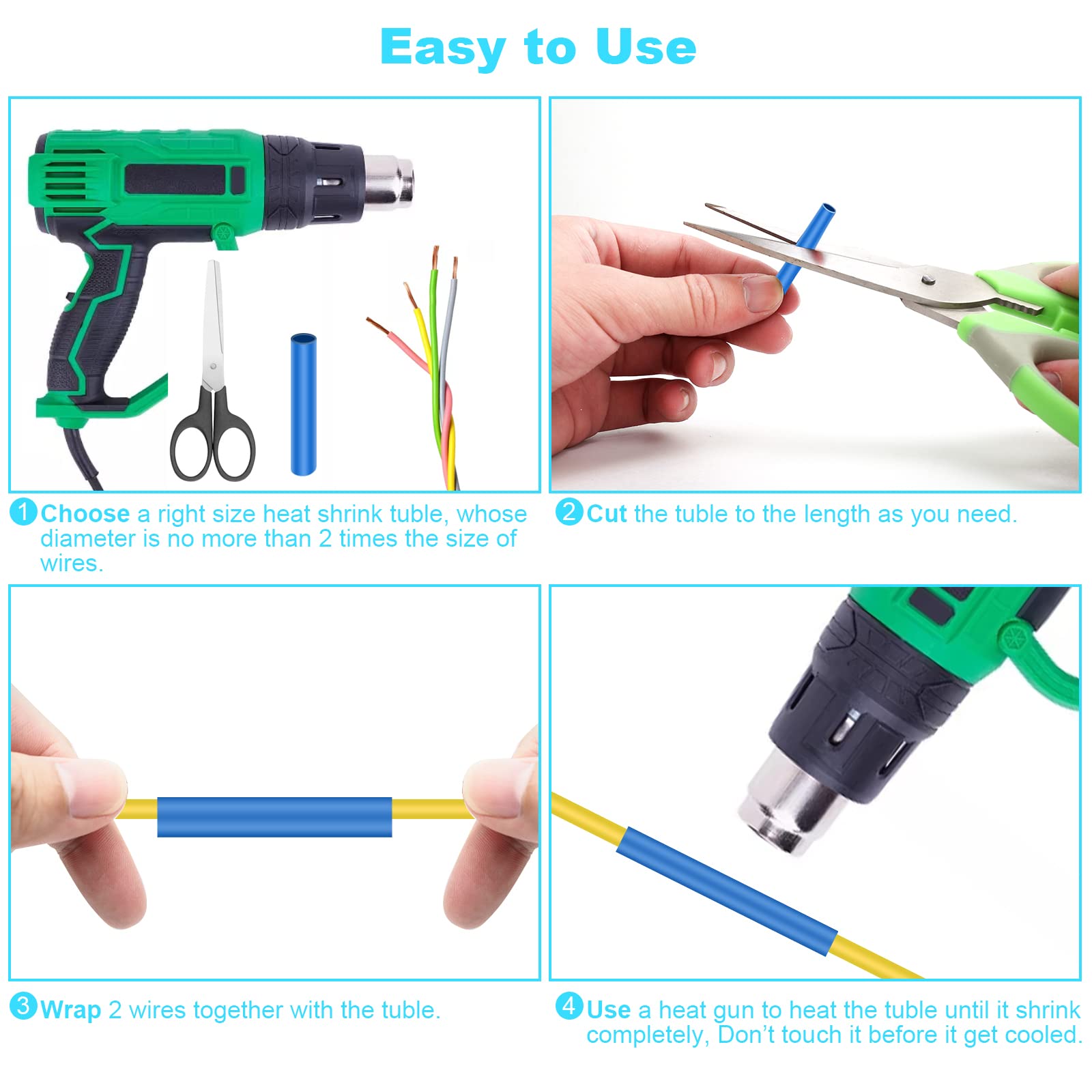 PREMIUM MATERIAL: Our color industrial heat-shrink tubing for wires made of polyolefin, shrinkage ratio: 2:1, and makes a tight seal. Our colored wire shrink wrap tubing has good electrical insulation, corrosion resistance and high temperature resistance.