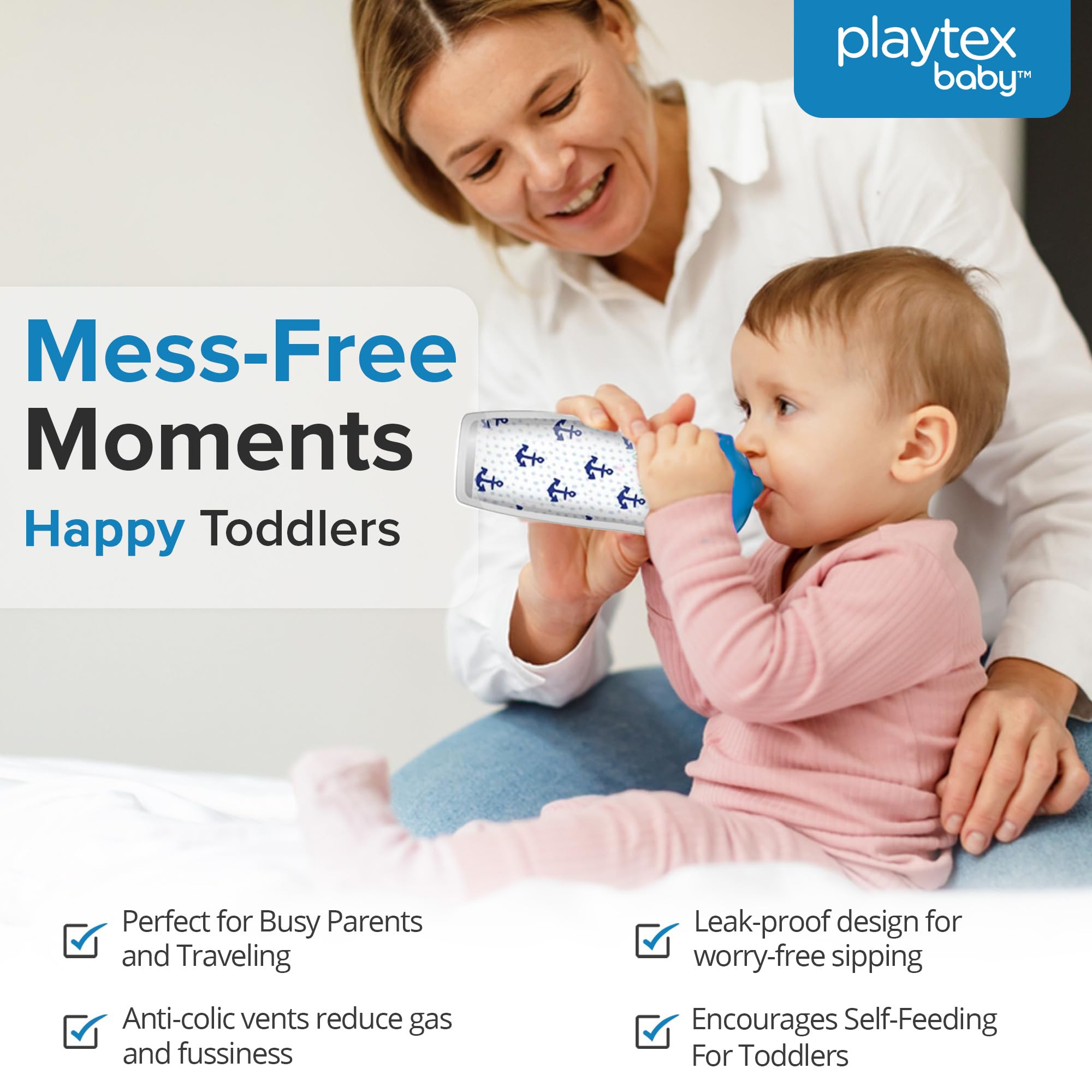 PERFECT FOR PARENTS: Playtex Baby's feeding system supports babies and toddlers with bottles that offer air-free feeding, nipples most like mom, sippy and toddler transition cups, and binkies that grow with your child and adapt to their unique needs