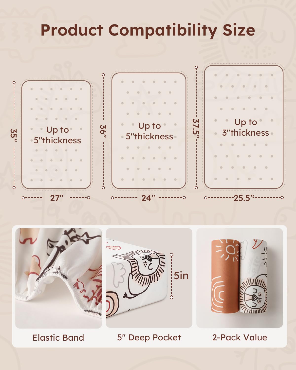 Snug Fit and Secure: Measuring 38"x26", Yoofoss mini crib sheets are designed to snugly fit most Pack n Play or potable playard mattress.The 3β5 inch deep pocket provides full coverage that wraps around the mattress to keep the sheet neatly in place, ensuring a safe and comfortable sleep for your baby.
