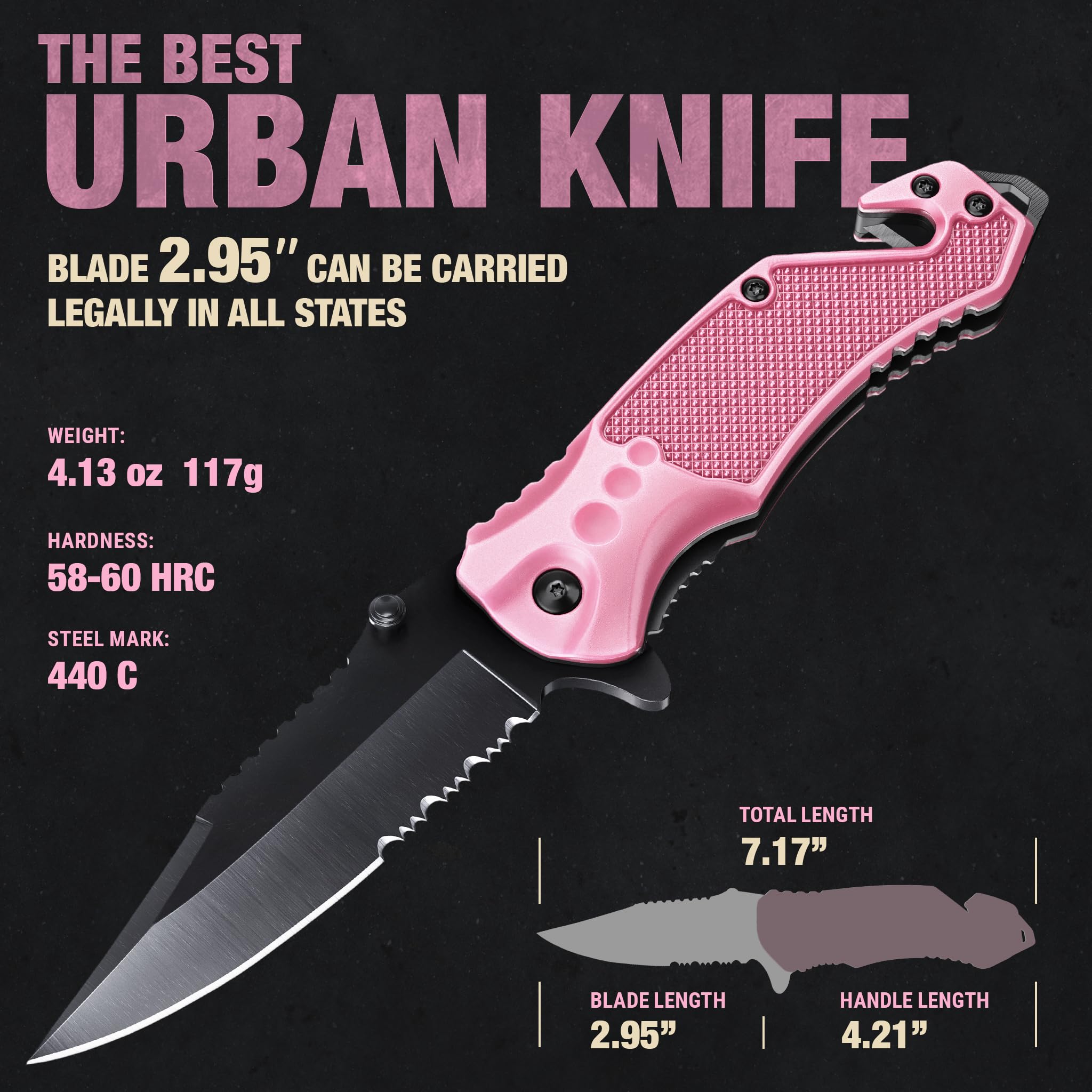 Cool design. 5-in-1 tactical folding knife equipped with a serrated blade, strap cutter, glass breaker, pocket clip, and lanyard hole. This common pocket knife is legal to carry in all states of the United States. Pink pocket knife for women is made of high quality stainless steel 440C, aluminum ergonomic handle. Lock type - liner lock. Blade length - 2.95”; Handle length - 4.2”; Overall length - 7.17”; Weight - 4.12 oz. Pocket knives & folding knives for women.