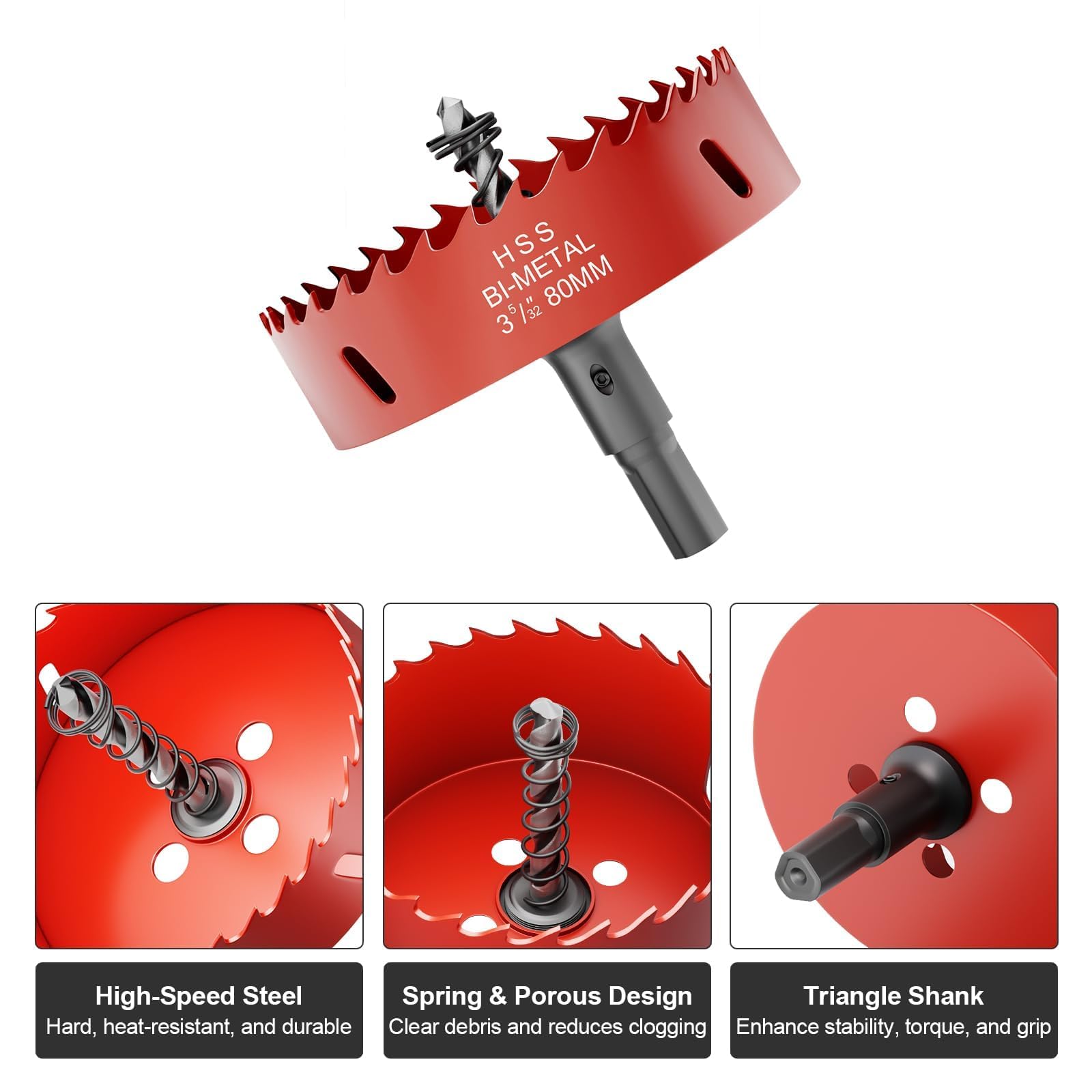 Ease to Use & Secure Clamping: The hole saw surface has clear size markings, allowing you to quickly select the desired hole saw model and get to work swiftly; The triangular shank design offers high compatibility, suitable for most standard drill chucks, especially handheld and bench drills; It facilitates quick and easy installation, preventing slipping, and ensuring a more stable grip that can withstand higher drilling torque, giving you peace of mind during use