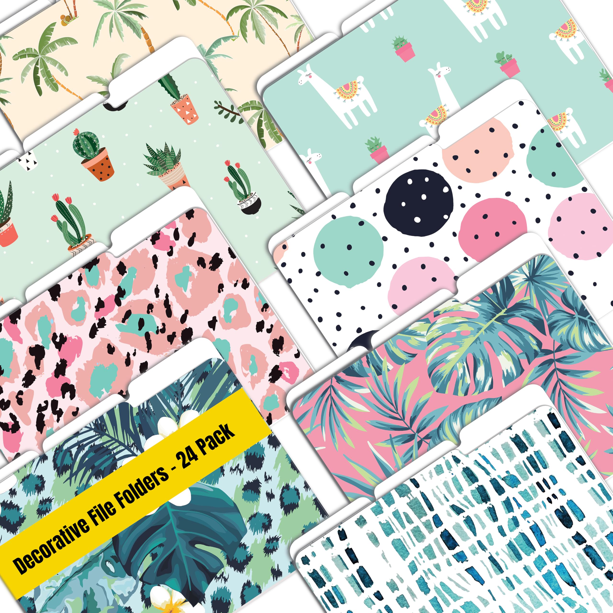Vibrant Floral Designs: This set of 12 cute file folders features six unique tropical patterns, including palm leaves and vibrant floral motifs. Ideal for those who appreciate colorful file folders, these patterns bring a refreshing aesthetic to any office setting