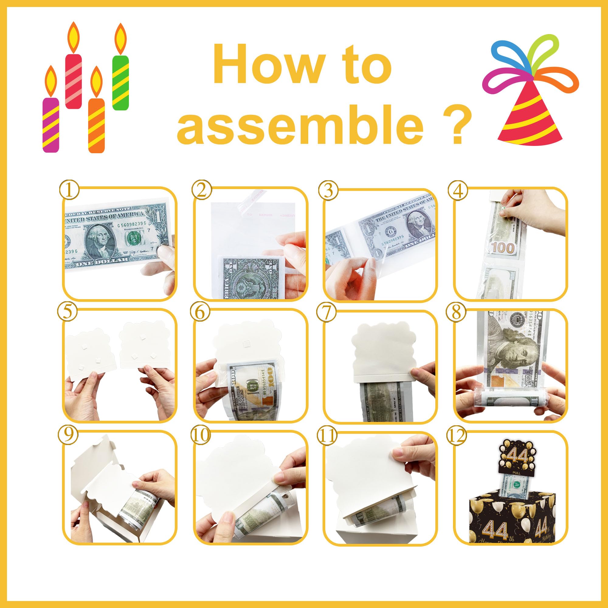 Surprise Gift Box: this gift box measures 5x5 inches, is made of durable cardboard. It also includes 2 theme-related shaped card(with adhere glue dots), 1 roll of transparent tape and 35 plastic pouches similar to the size of U.S. currency for easy placement of bills.