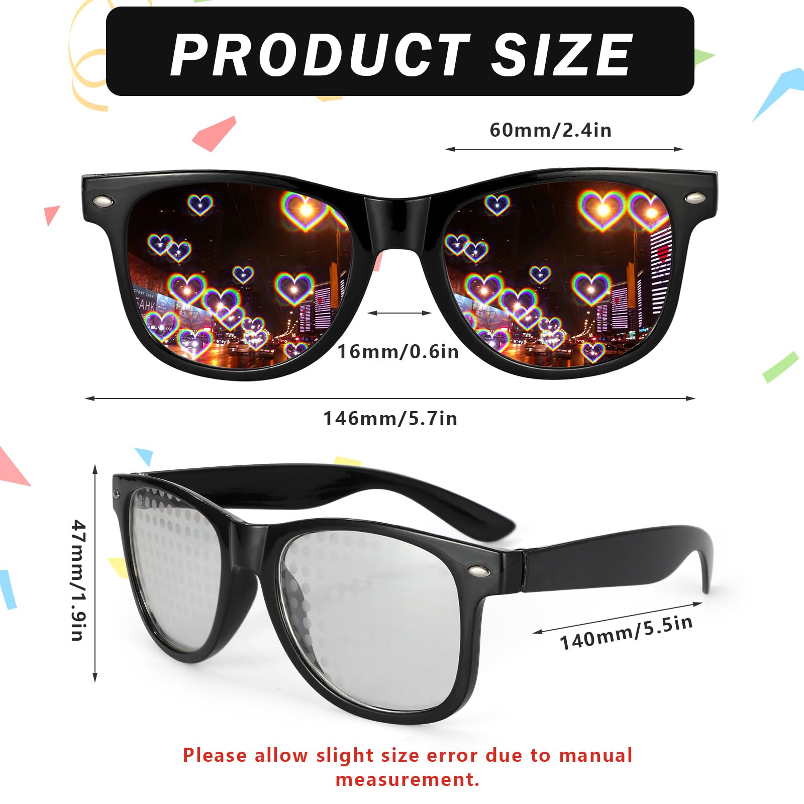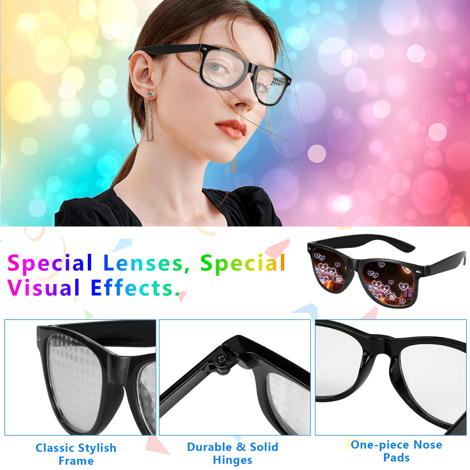 【Rainbow Heart Pentagram Special Effect Glasses】The 3 pairs of refraction glasses have special effect lenses, which can respectively reflect 3 different effects: 3D prism rainbow, colorful stars, and colorful hearts. The more light points, the more diffracted shapes are clearer, as if they are in front of your eyes, and the visual effect is richer.