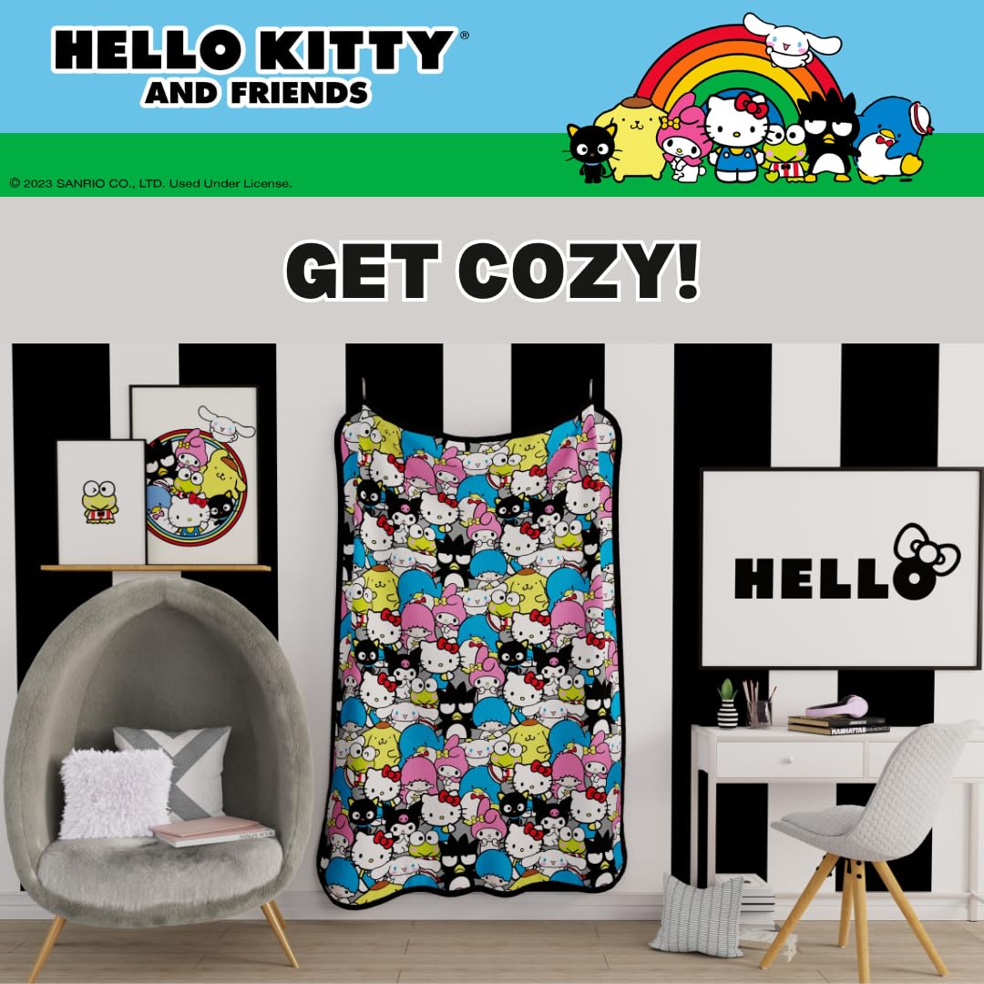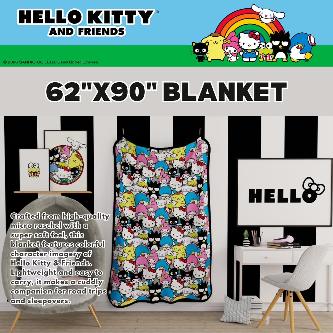 The Hello Kitty & Friends Rotary Blanket is a delightful fusion of comfort and cuteness, designed to captivate Sanrio fans of all ages. Measuring a generous 62"x90", this blanket envelops you in warmth and softness, making it perfect for snuggling up on chilly days or adding a touch of whimsy to your living space. Crafted from premium micro raschel fabric, it offers a luxurious feel against your skin while ensuring durability for years to come. The vibrant design features all your beloved Sanrio characters, including Hello Kitty, My Melody, Keroppi, and more, creating a visual feast of nostalgia and charm. This officially licensed product proudly showcases the iconic Sanrio characters, making it a coveted collector's item for fans worldwide. Whether you're using it as a throw blanket, bedspread, or wall hanging, the Hello Kitty & Friends Rotary Blanket adds a playful touch of magic to any setting. Wrap yourself in the world of Sanrio with this must-have blanket.