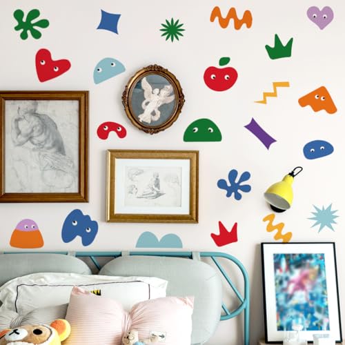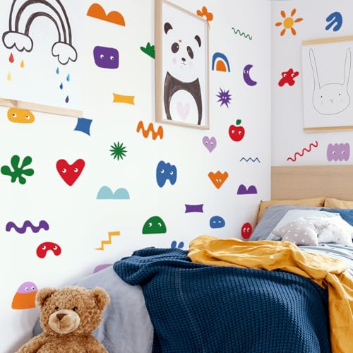 Package Contents: The complete set includes 1 sheet of colorful geometric-themed wall decals featuring dozens of abstract patterns such as stars, waves, hearts, flowers, and irregular color blocks. All elements can be freely combined and applied to fulfill one-stop whimsical wall decoration needs.