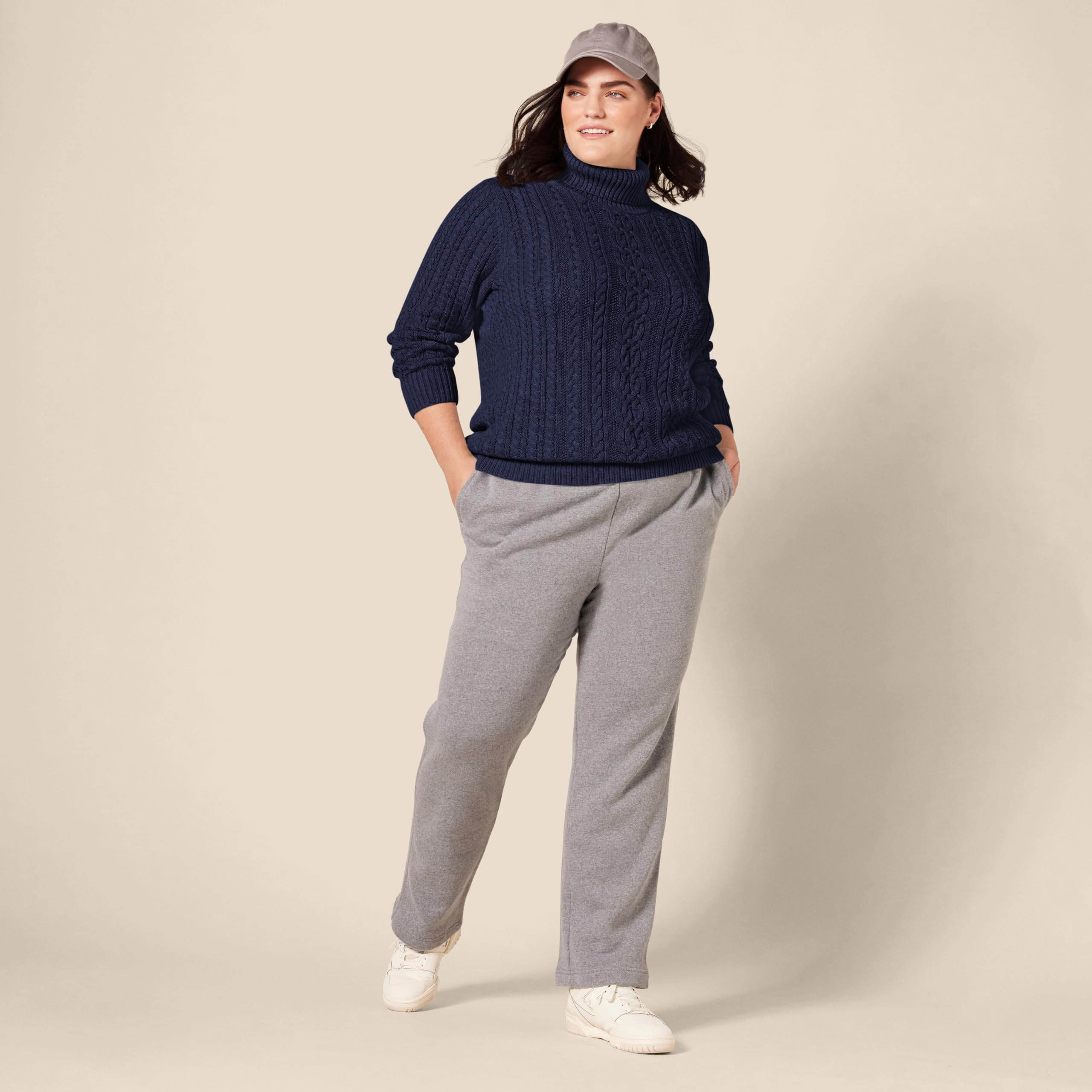 DETAILS: Features classic fisherman cable pattern, a fold-over turtleneck, long sleeves, and rib detail at neck, cuffs, and hem.