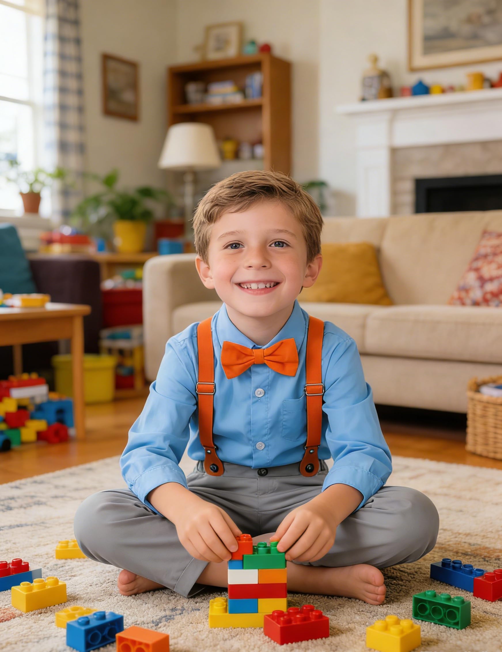 Toddler boy dress outfit consists of long sleeve dress shirt, elastic-waist pants, detachable bow tie and stretch suspender.